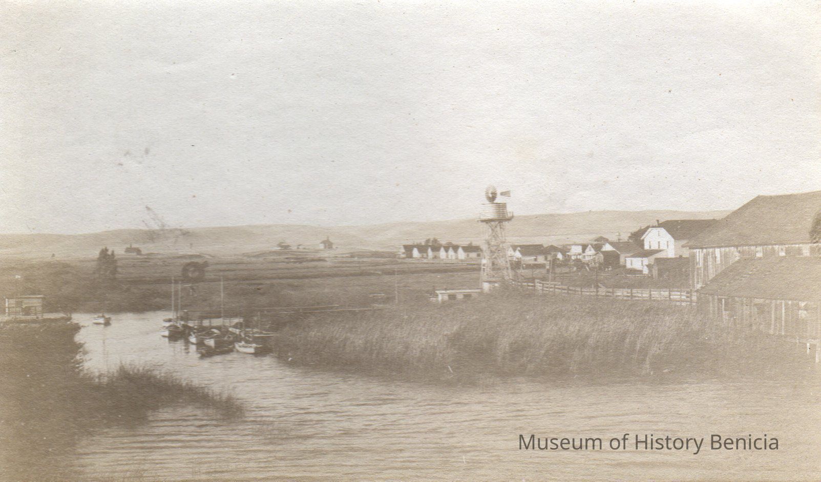 Old view of Benicia taken from the water looking to the west (?) side of Benicia. The rolling hills have no houses.