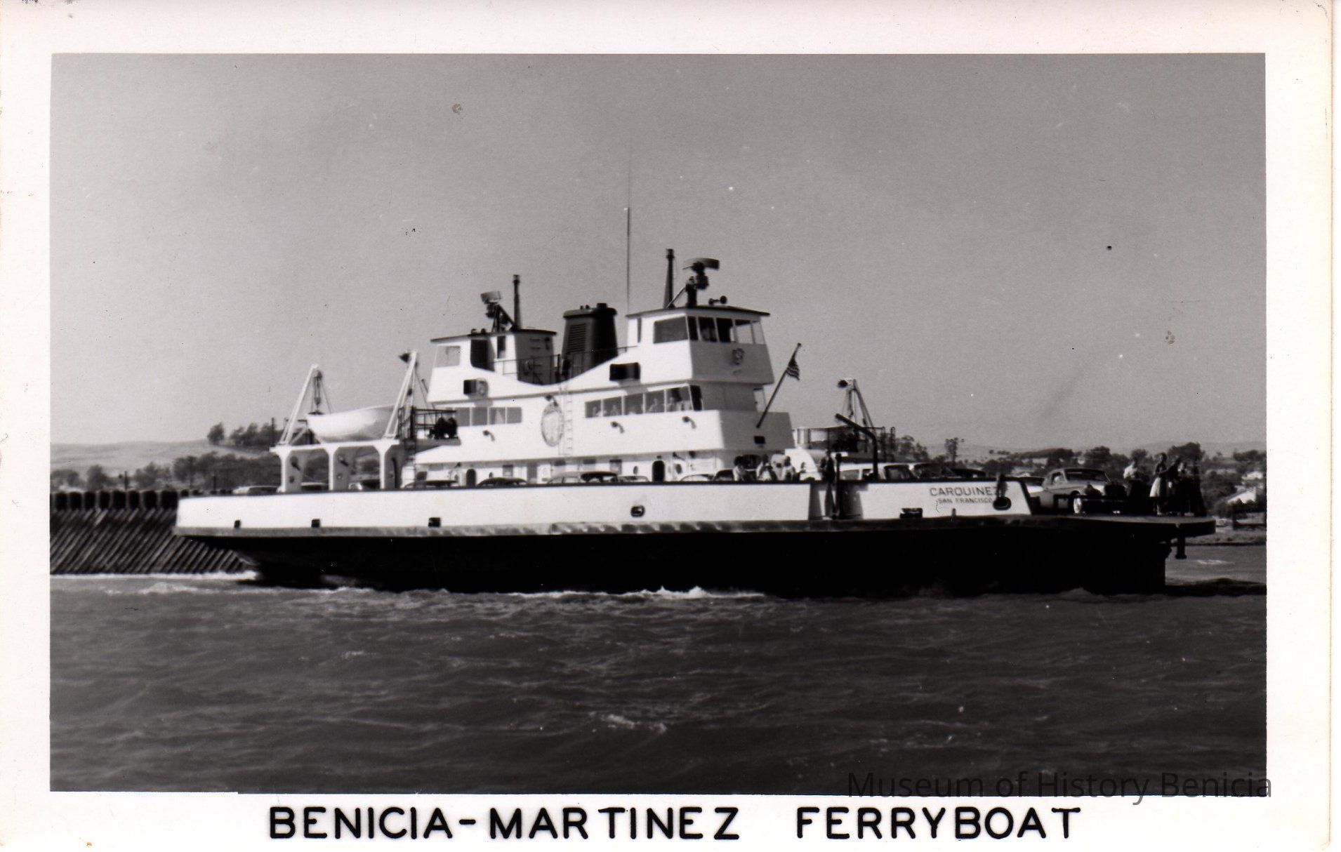 B/W image of a Benicia-Martinez Ferry boat. Shows the "Carquinez" automobile/passenger ferry that operated from 1953-1962.