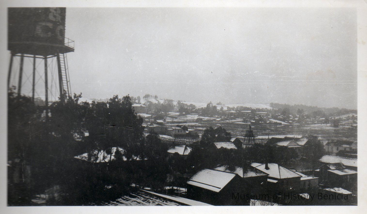 Benicia snow scene: snow seen on roof tops (location?) in Benicia. The straits can be seen in the background. See also 2004.011.0263Collection
