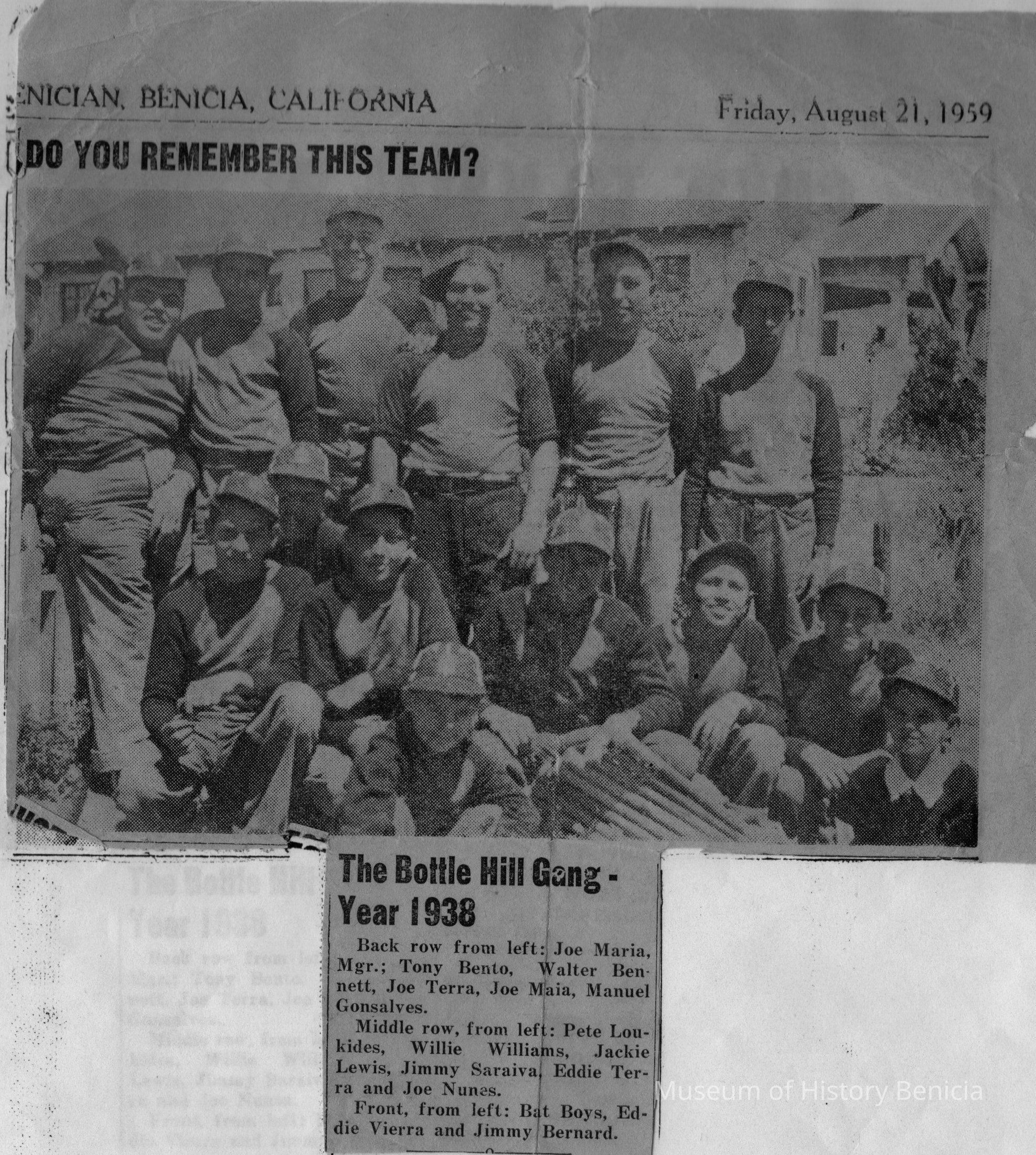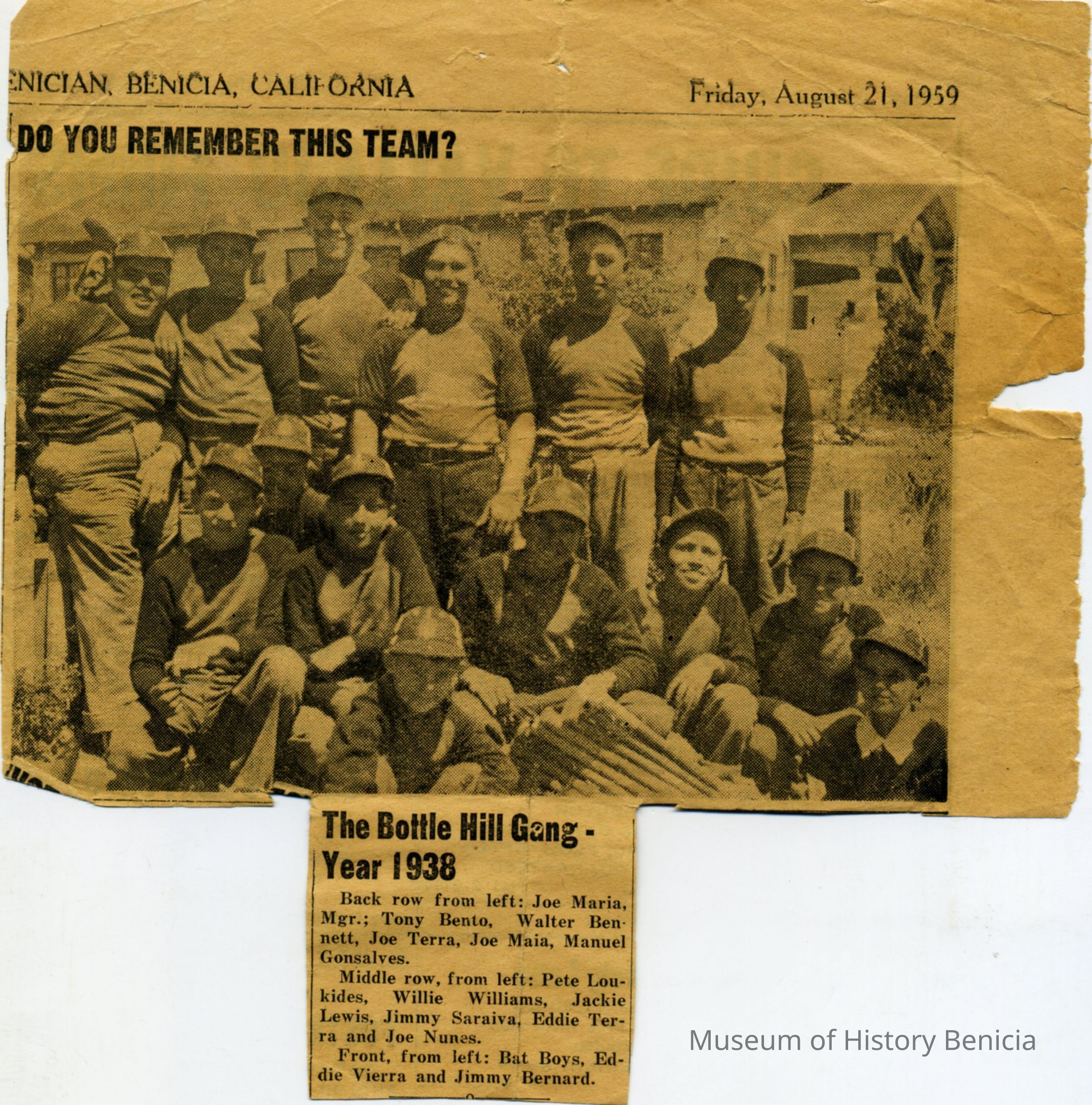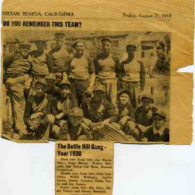 Shows a photograph with title "Do You Remember This Team?" and caption "The Bottle Hill Gang - Year 1938" Back row from left: Joe Maria, Mgr.; Tony Bento, Walter Bennett, Joe Terra, Joe Maia, Manuel Gonsalves. Middle row, from left: Pete Loukides Willie Williams, Jackie Lewis, Jimmy Saraiva, Eddie Terra, and Joe Nunes. Front, from left: Bat Boys, Eddie Vierra and Jimmy Bernard.Collection
