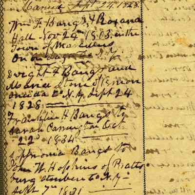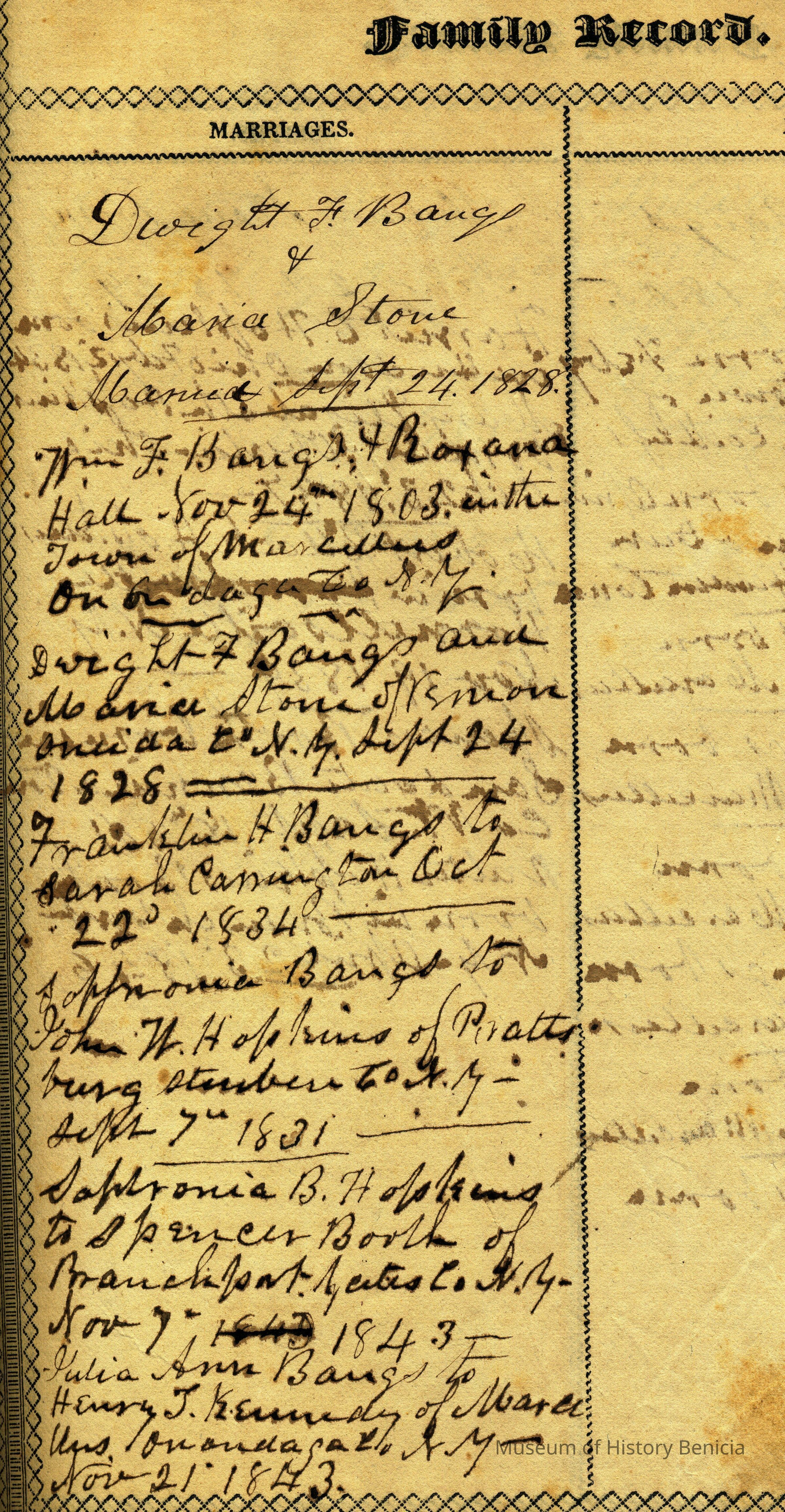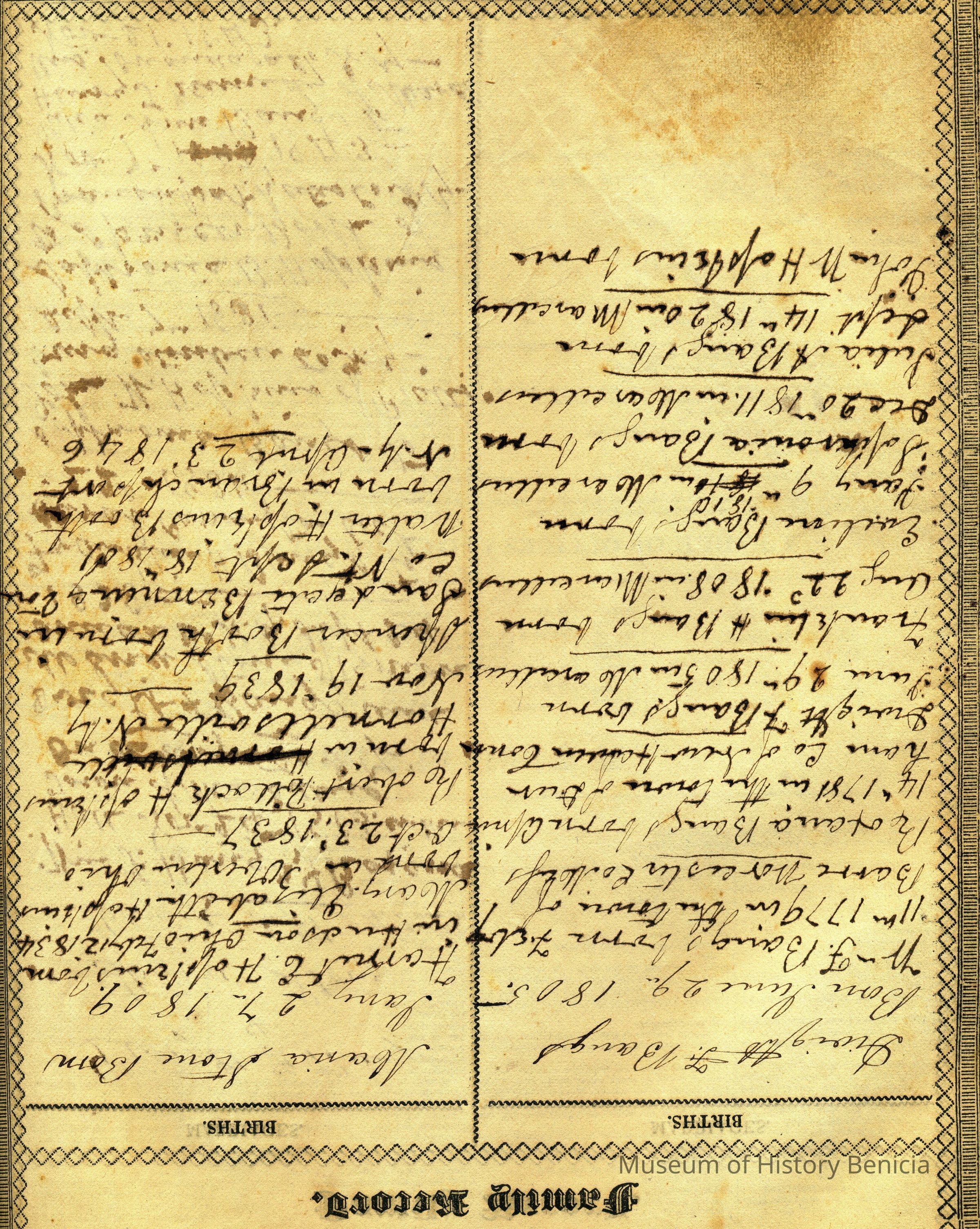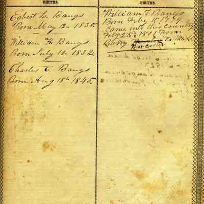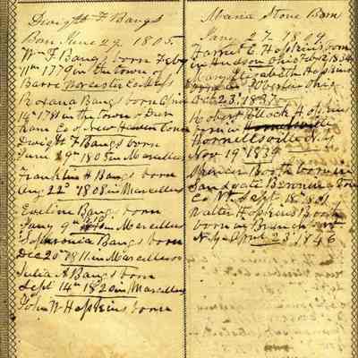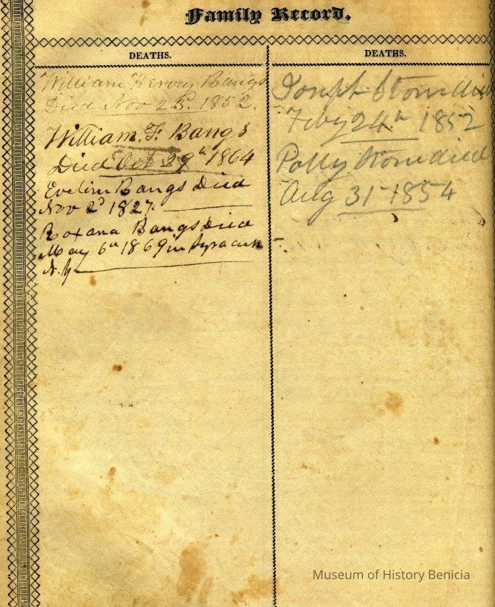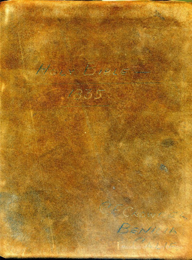 Holy Bible 1835 Bound in Brown Suede by owner New Testament 1834 with the Aprocrykha and Concordance Once belonged to a Benicia resident, purchased by donor from Bible Book Store in Vallejo There are family records of birth and marriage for a family named "Bangs" from New York going back to 1803.