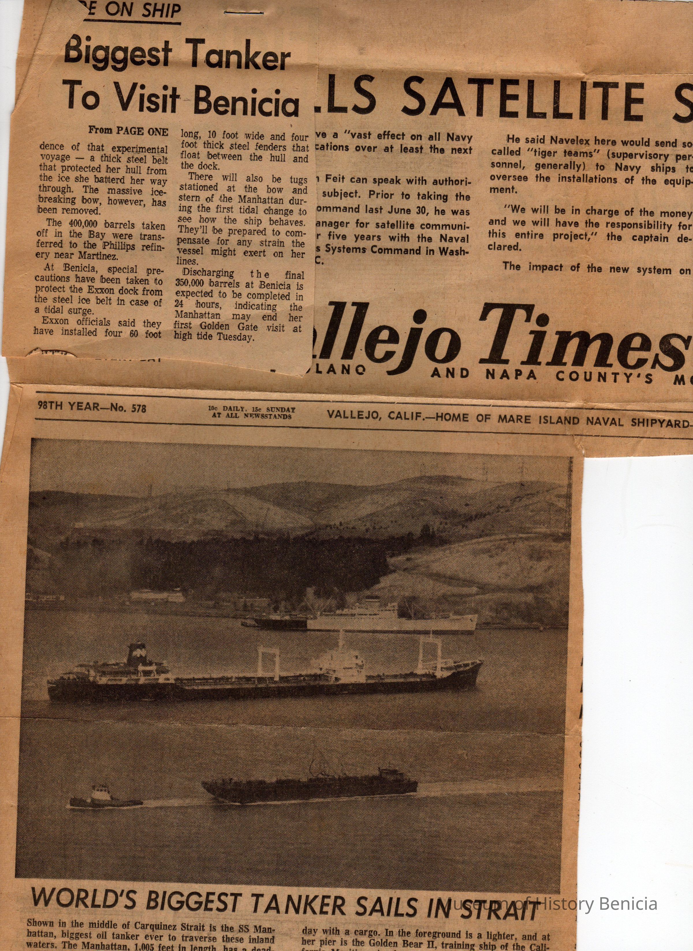 From the Vallejo Times-Herald dated Monday, October 8, 1973. Article is about the SS Manhattan coming into the Carquinez Straits, article titled "Biggest Tanker to Visit Benicia"Collection