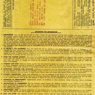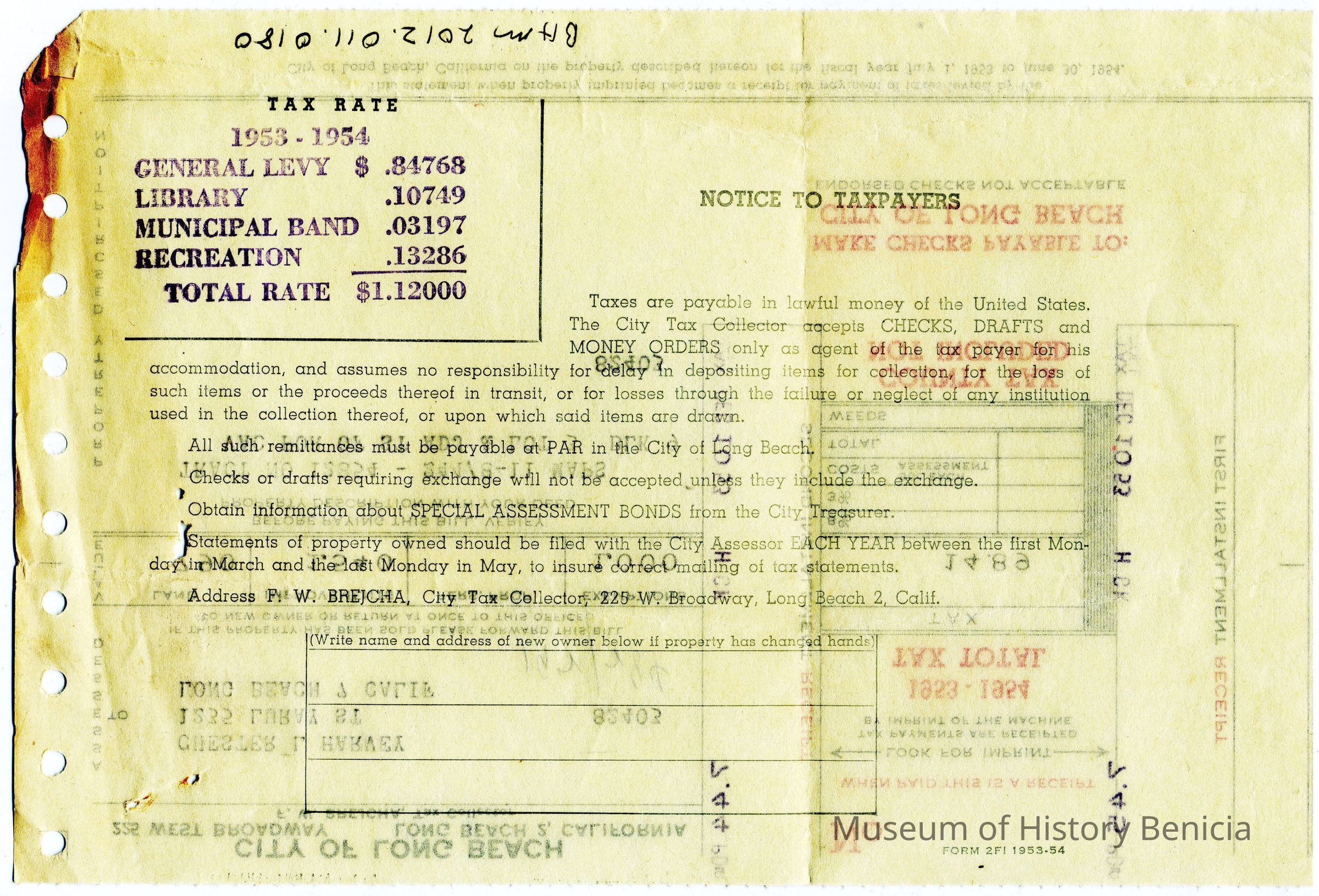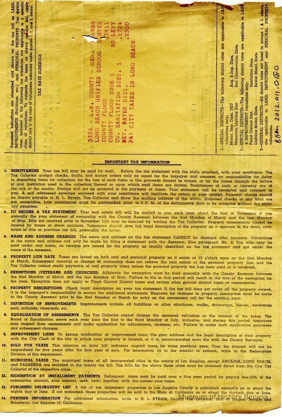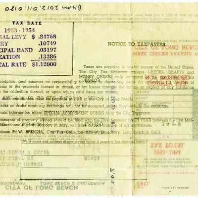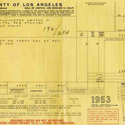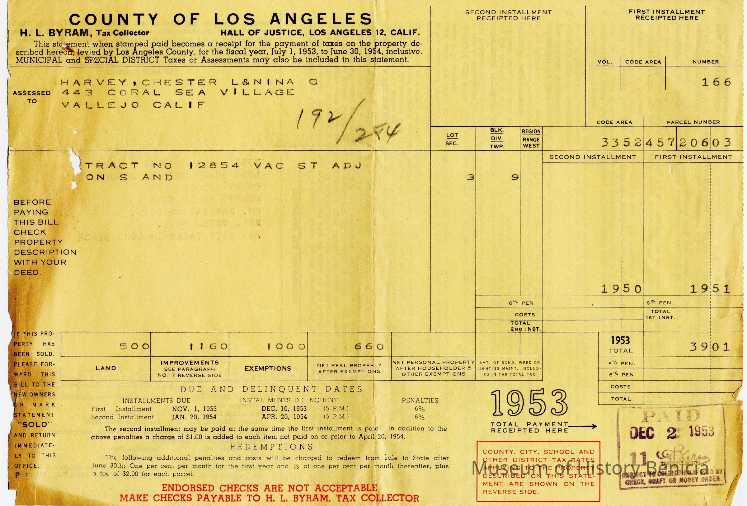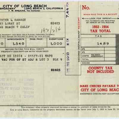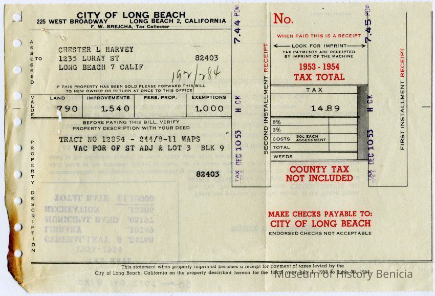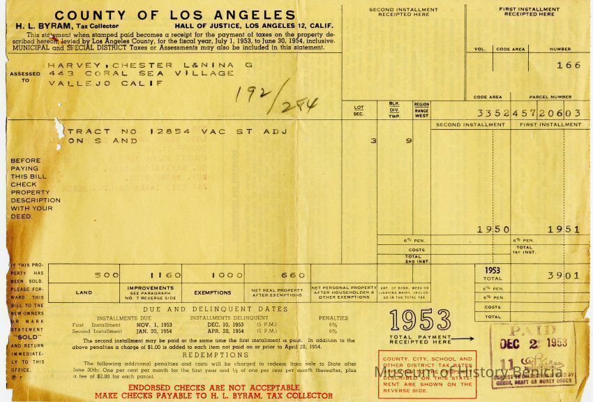 Tax bill from Los Angeles County for Chester & L&Nina G Harvey at 443 Coral Sea Village in Vallejo California. It is for the 1953 - 1954 tax year.Collection