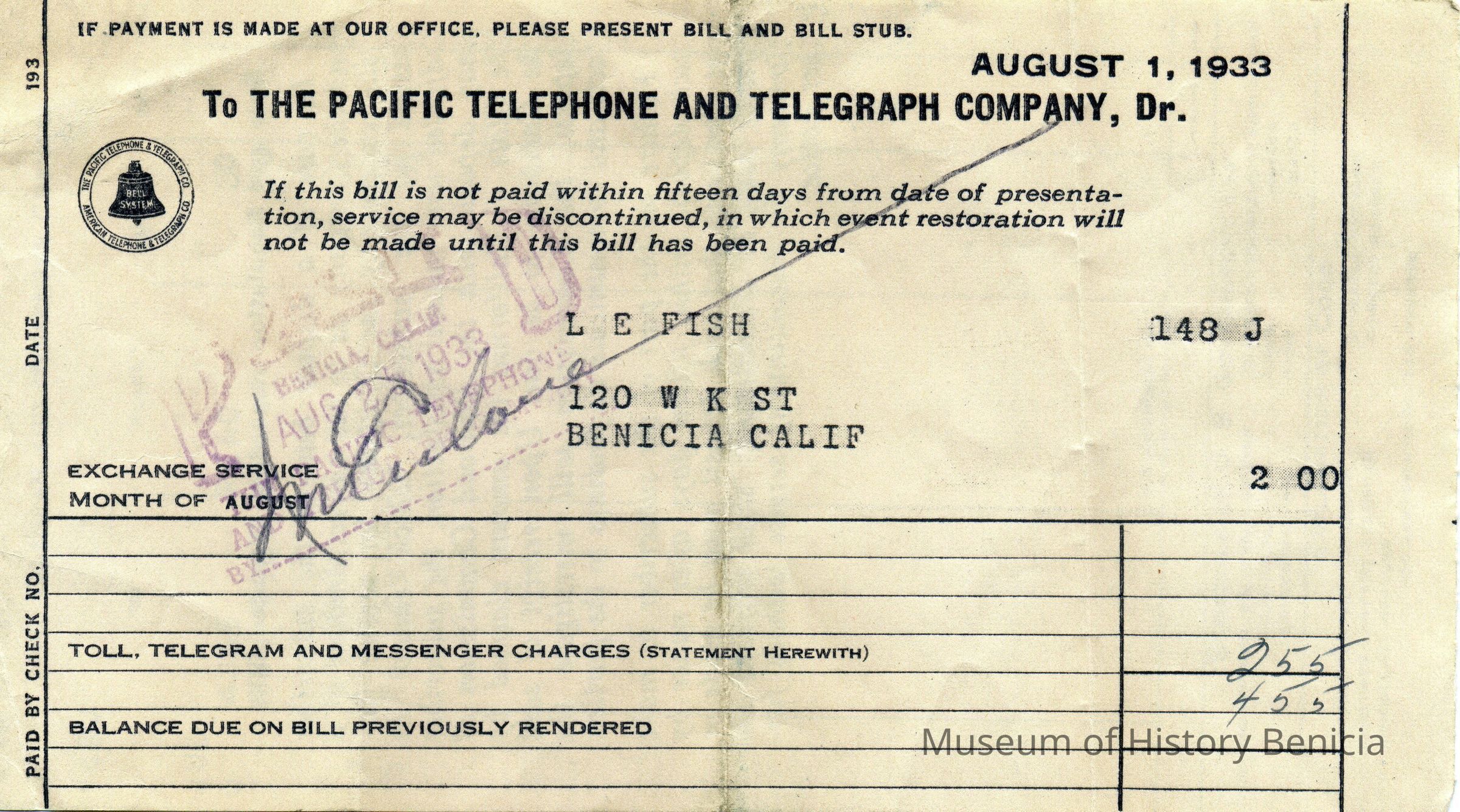 Bill from the Pacific Telephone and Telegraph Company to L. E. Fish at 120 W K St Benicia CA