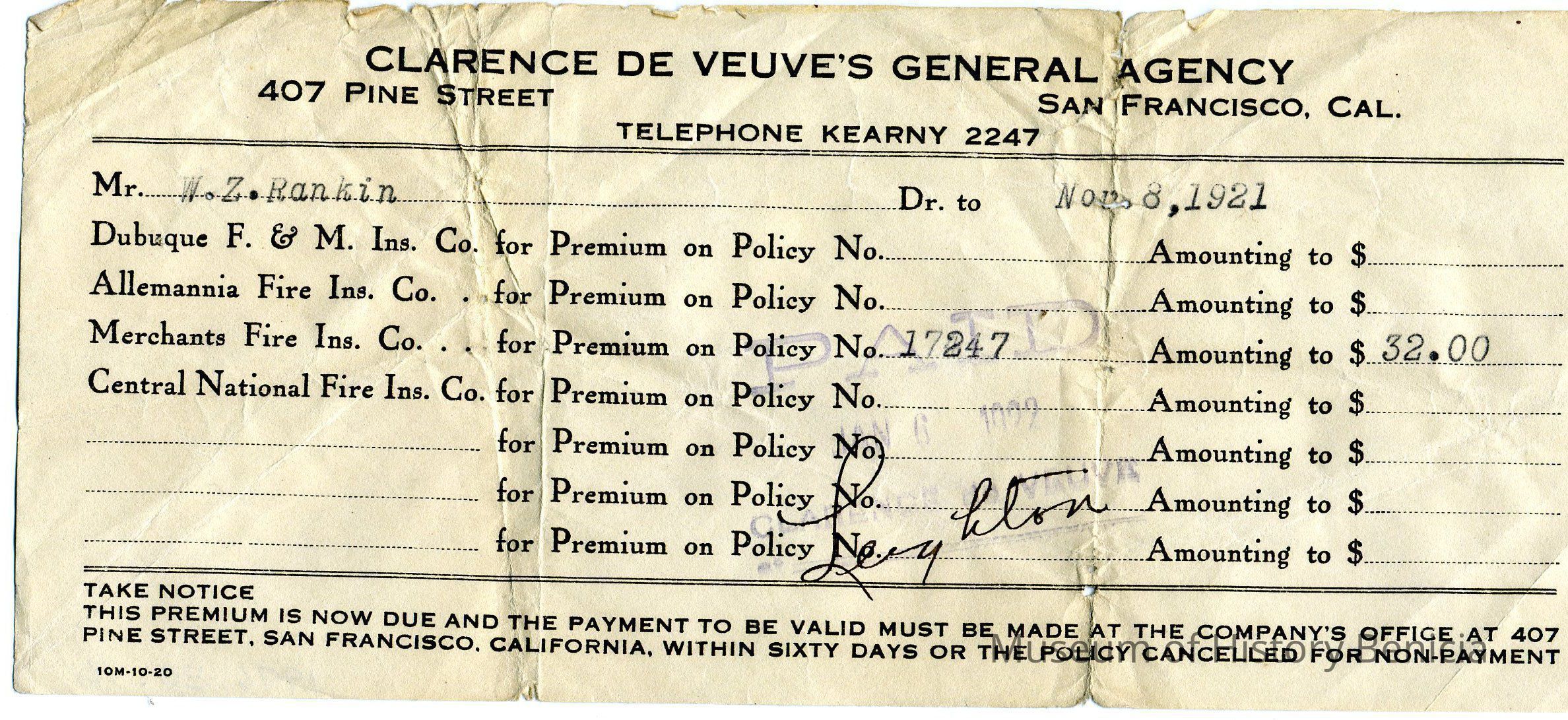 made out to W. Z. Rankin - Nov. 8, 1921 for Merchants Fire Ins. Co.