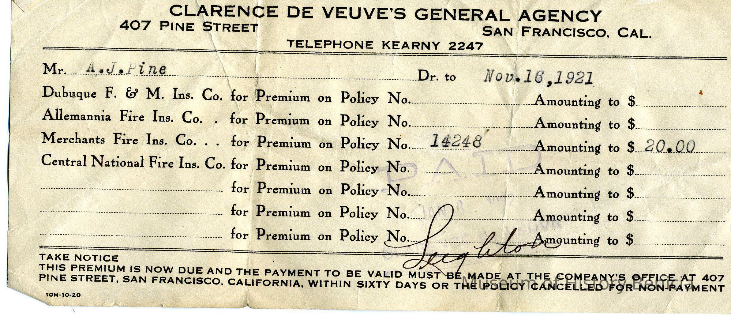 made out to A. J. Pine - Nov. 18, 1921 for Merchants Fire Ins. Co.