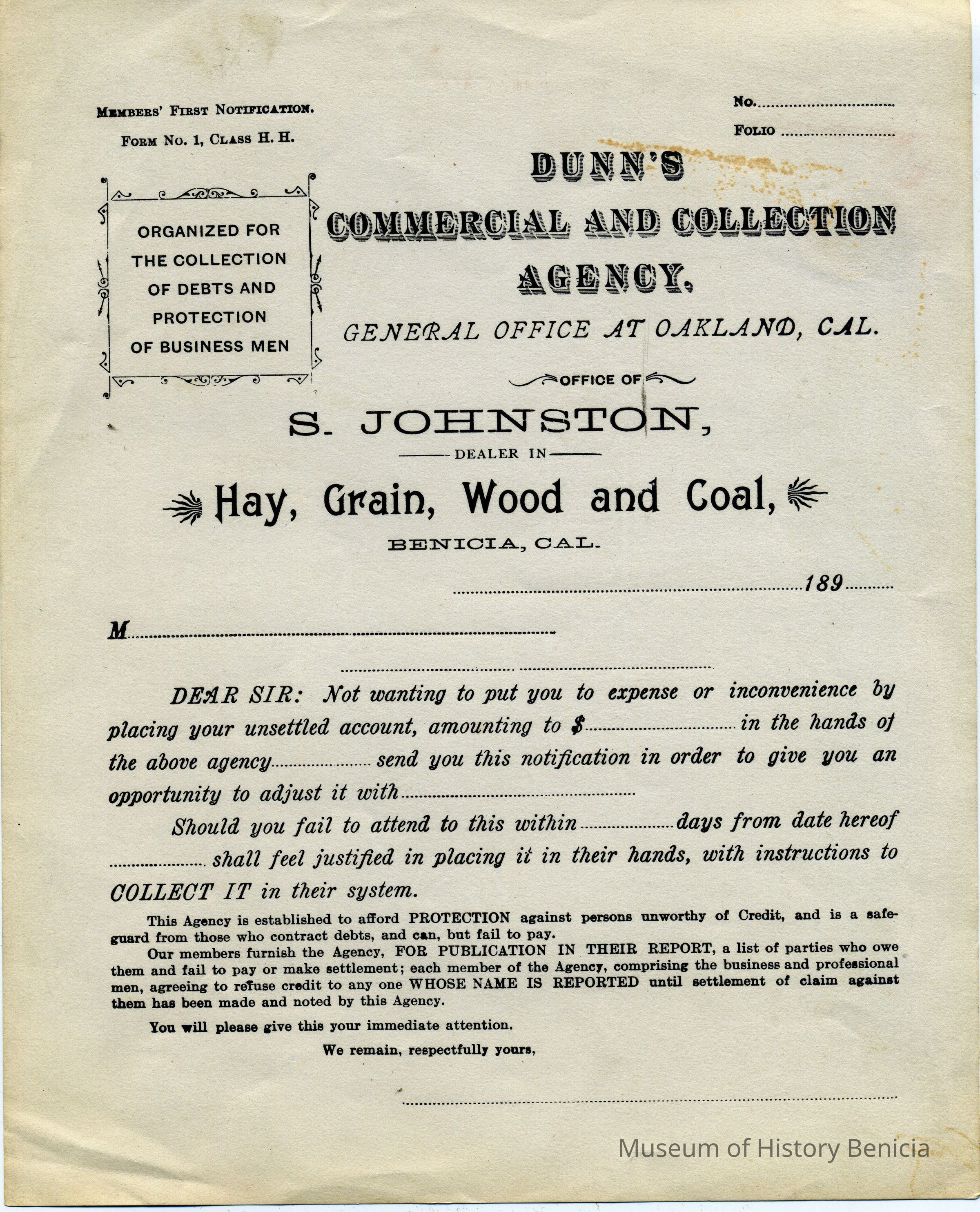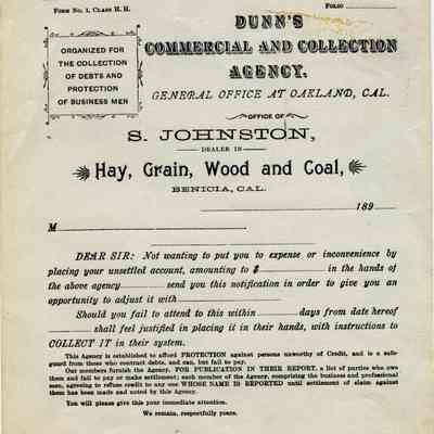 This is a pre-printed notice used by S. Johnson Dealer in Hay, Grain, Wood and Coal in Benicia. The notice advises people that their accounts are "unsettled" and if not paid in by a set date they will be turned over to Dunn's Commercial and Collection Agency. We don't know the exact date of this notice but the preprinted year field says "189_". Must have been in the 1890's.Collection