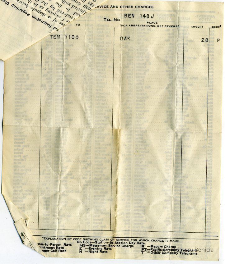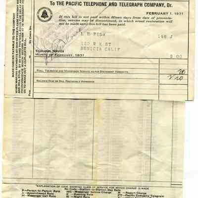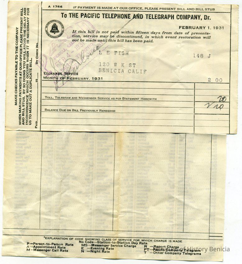 Bill from the Pacific Telephone and Telegraph Company to L. E. Fish at 120 W K St Benicia CA