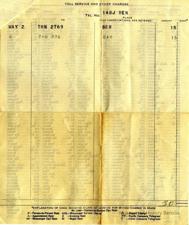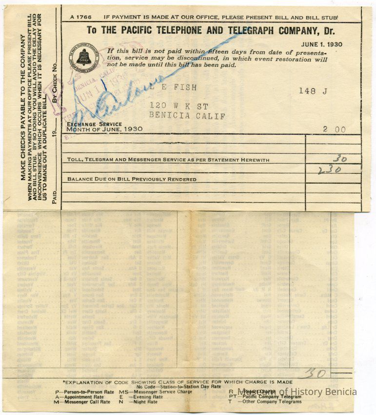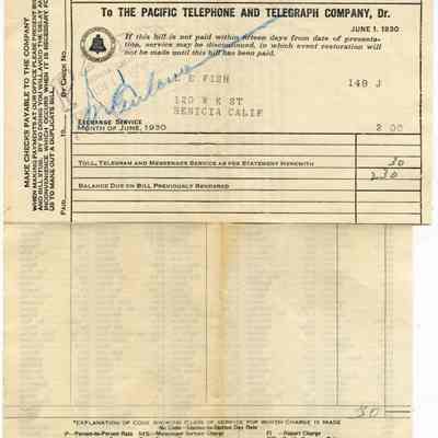 Bill from the Pacific Telephone and Telegraph Company to L. E. Fish at 120 W K St Benicia CA