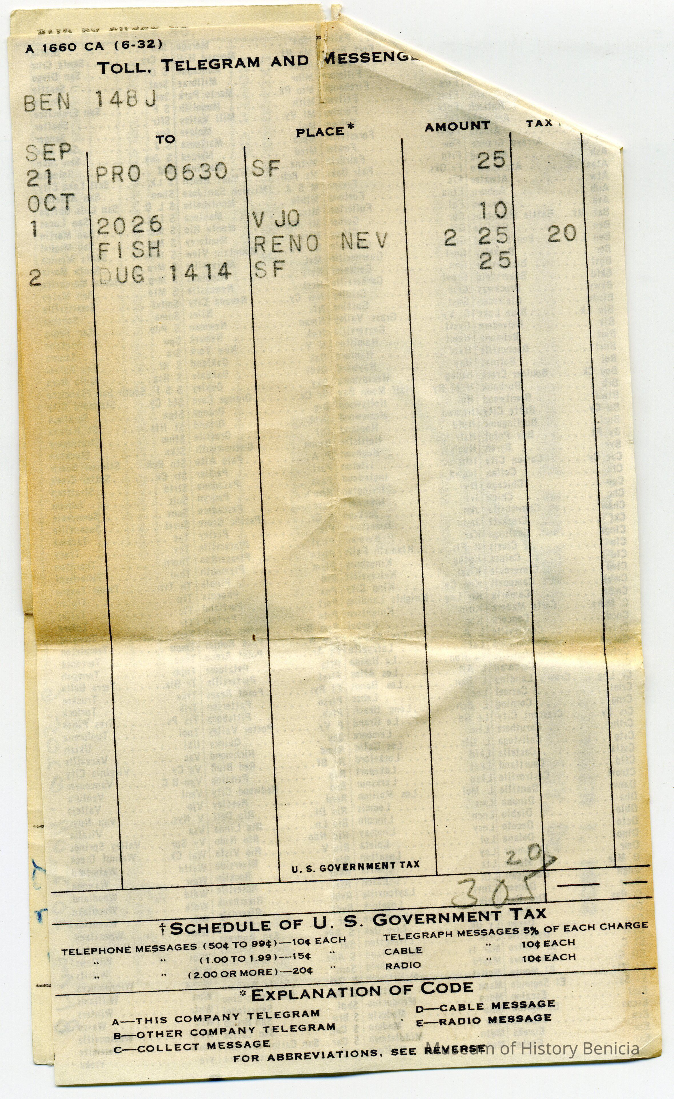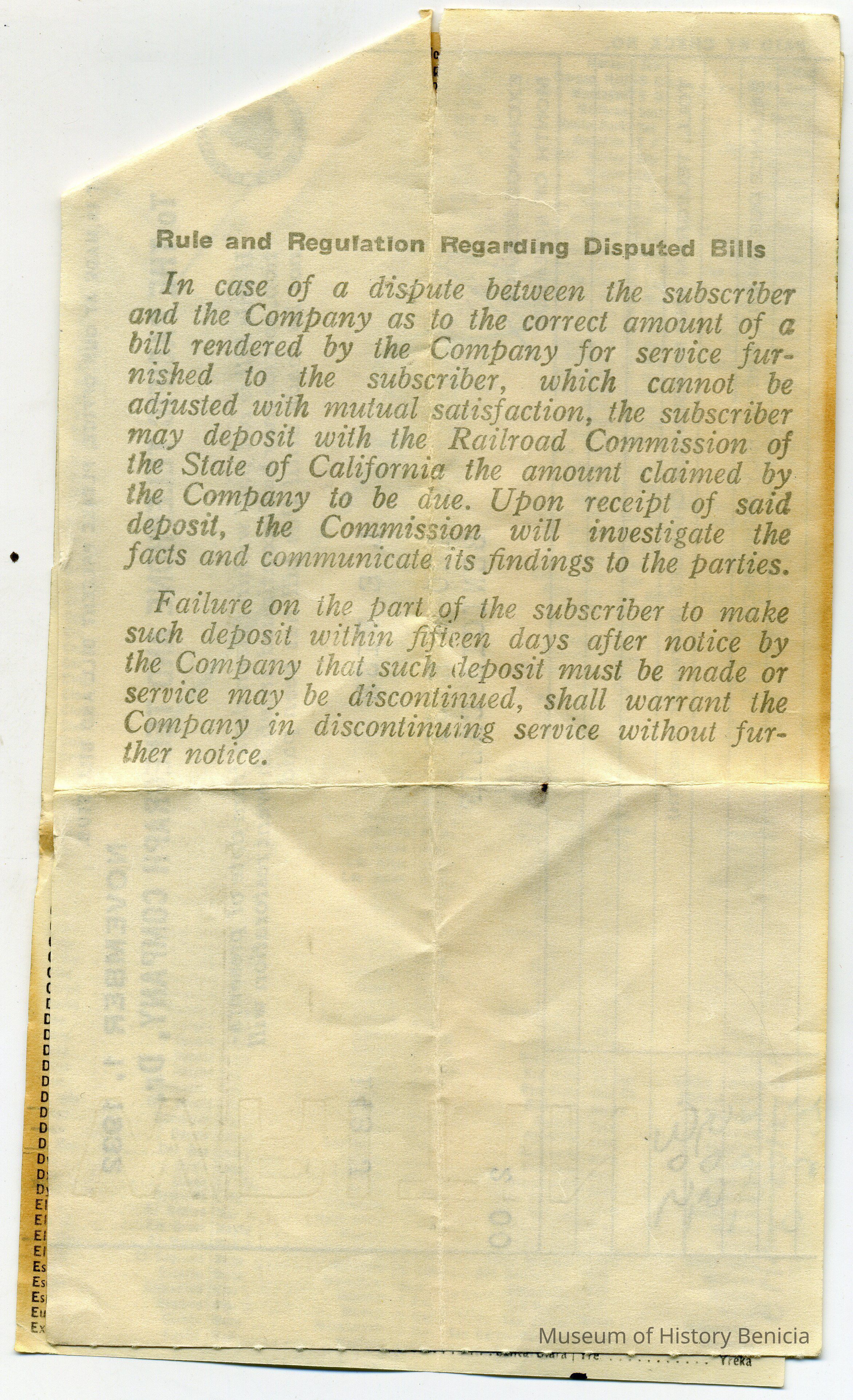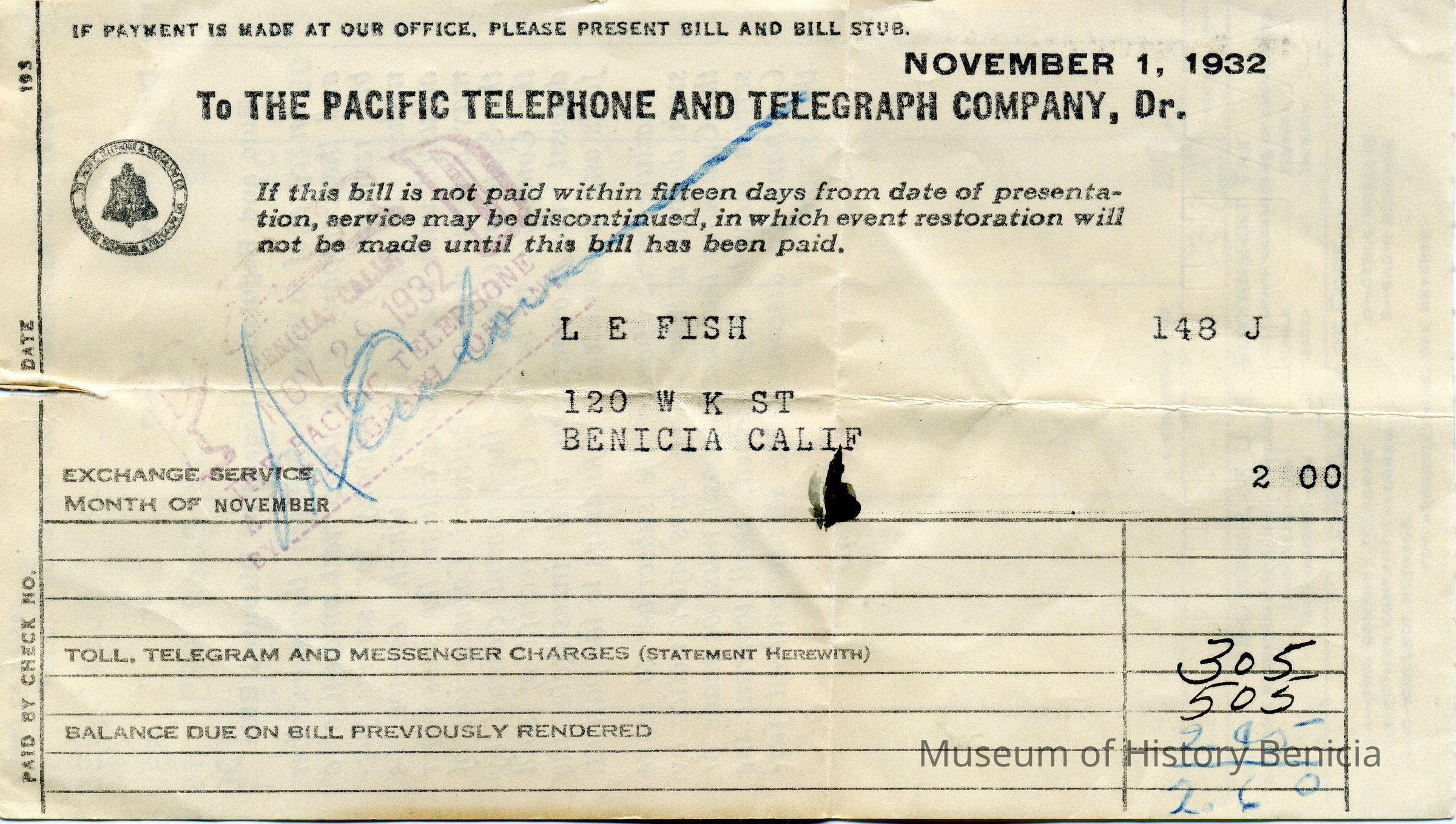 Bill from the Pacific Telephone and Telegraph Company to L. E. Fish at 120 W K St Benicia CA