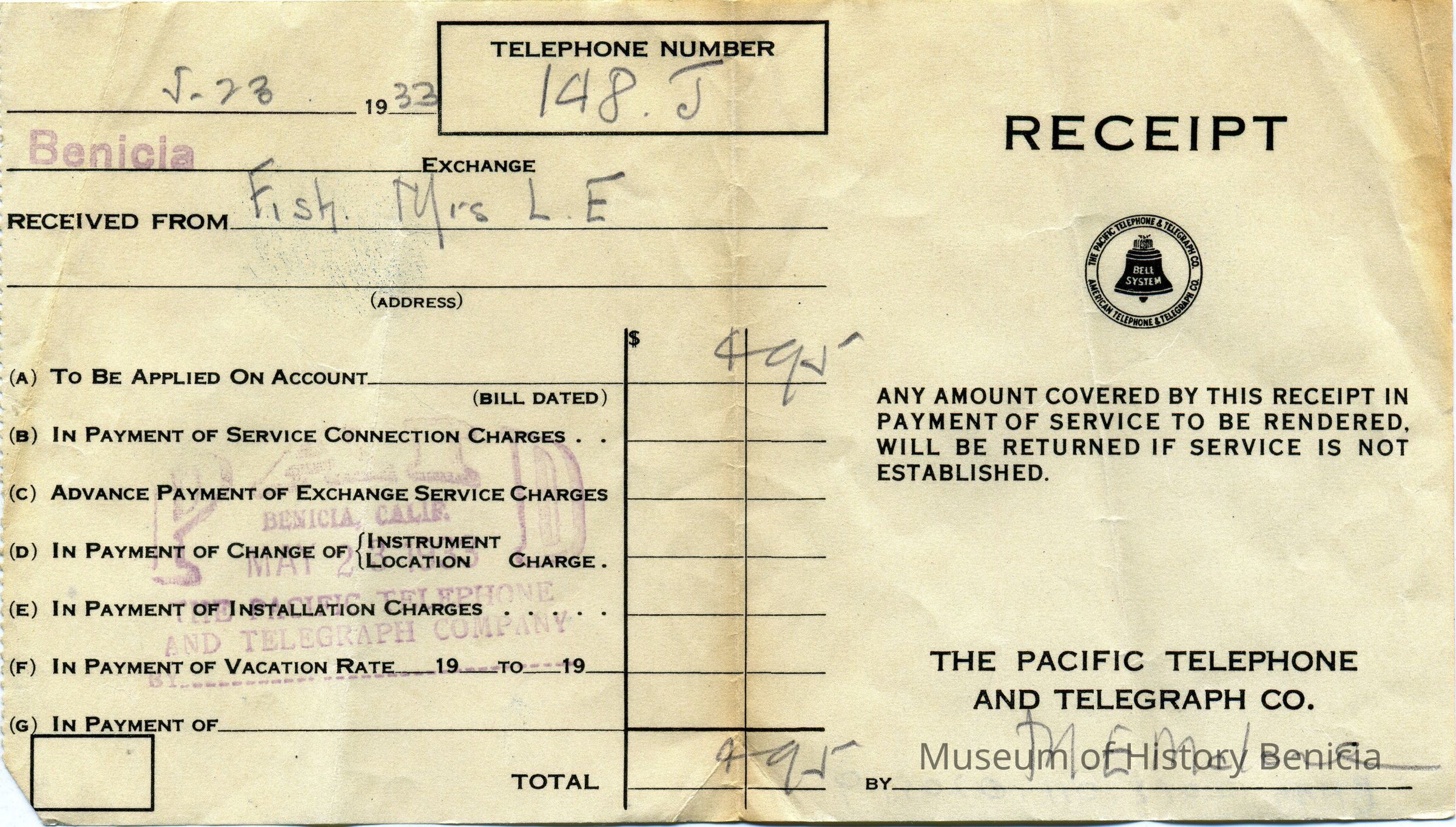 Bill from the Pacific Telephone and Telegraph Company to L. E. Fish at 120 W K St Benicia CA
