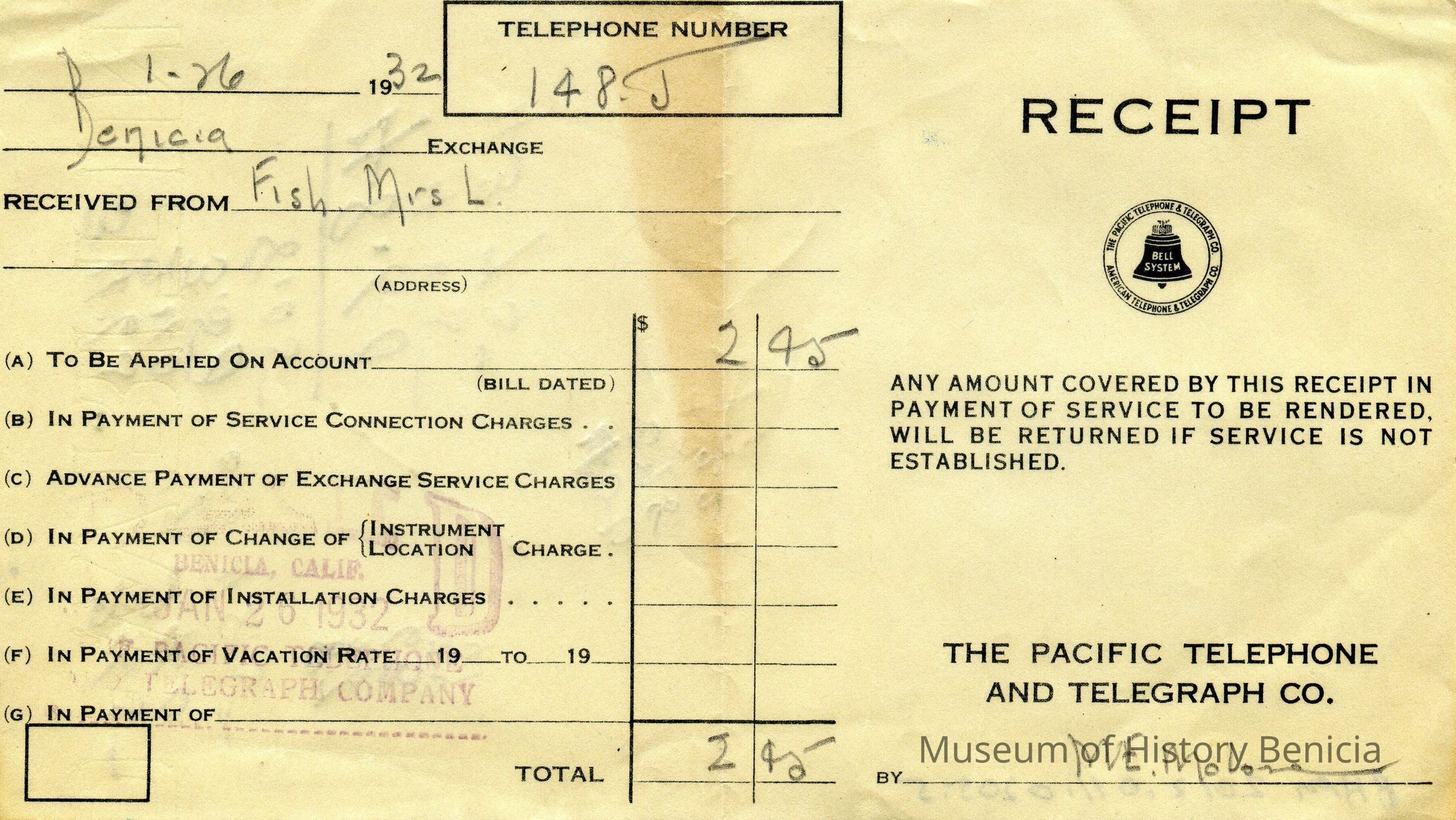 Bill from the Pacific Telephone and Telegraph Company to L. E. Fish at 120 W K St Benicia CA