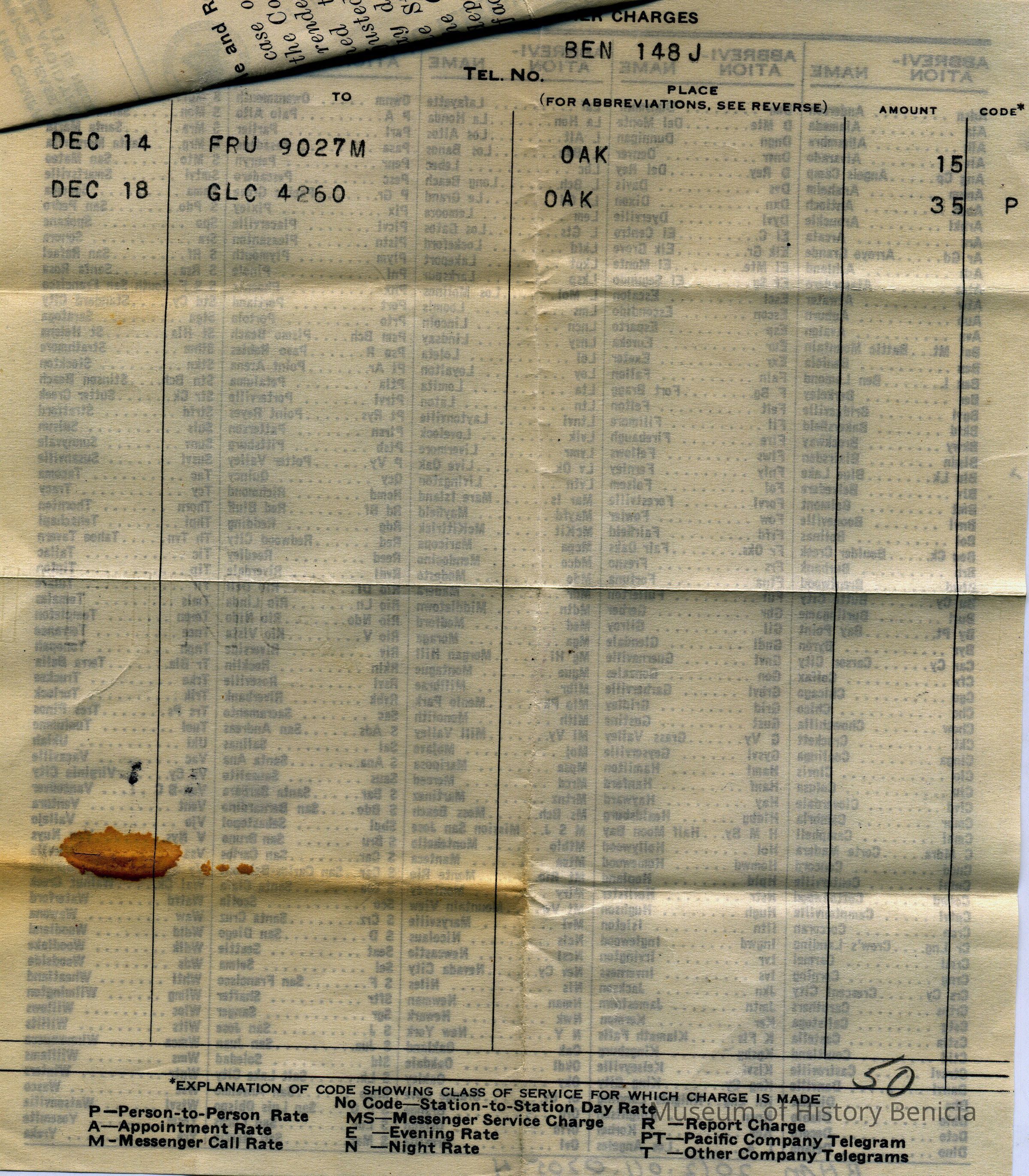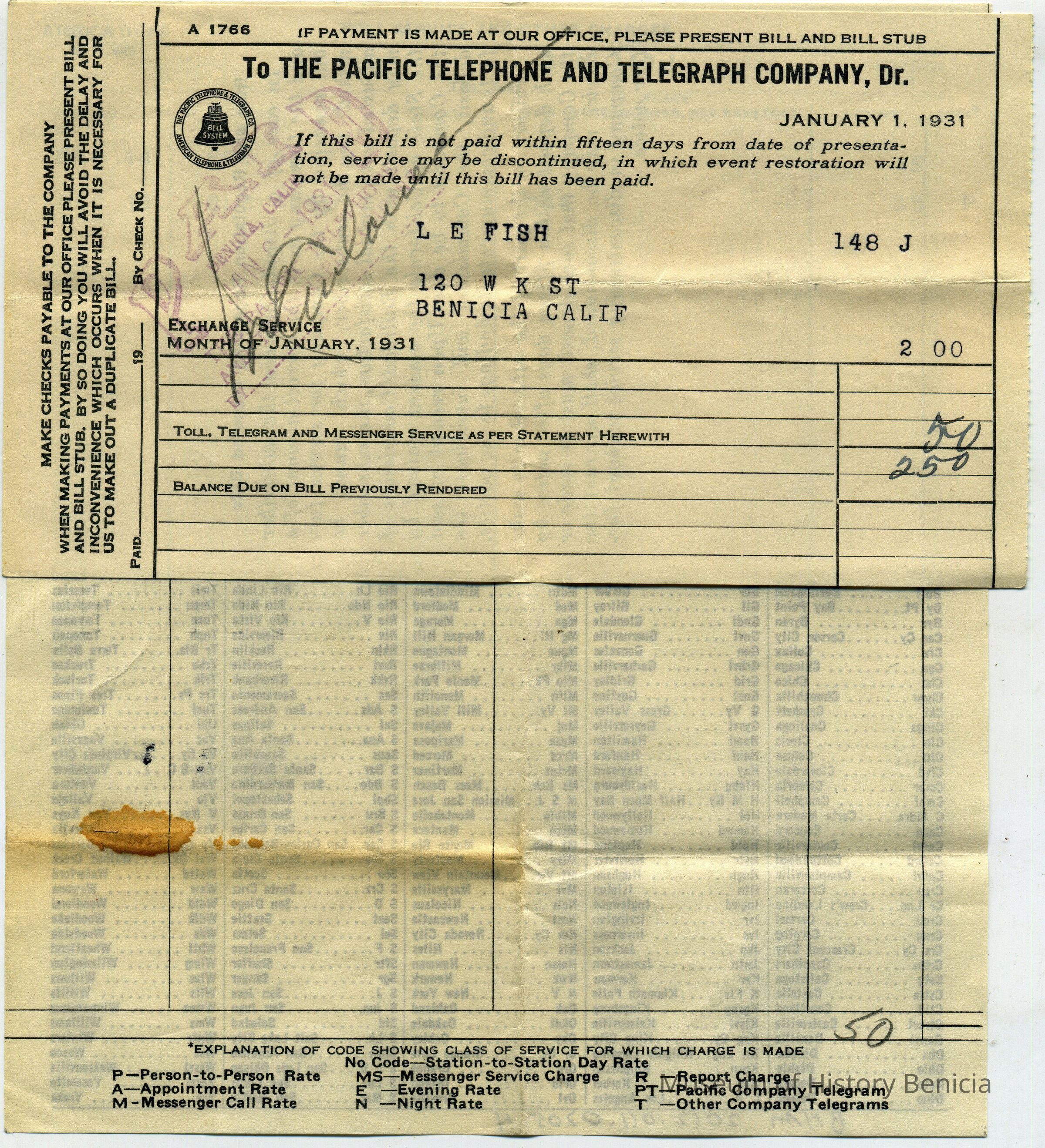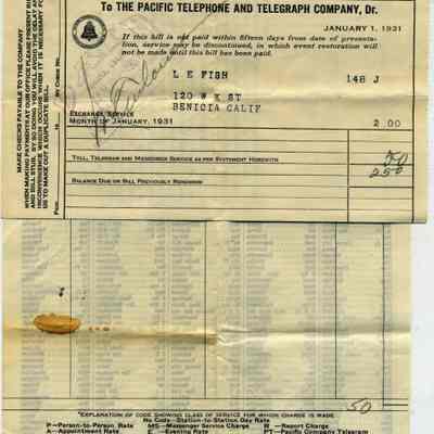 Bill from the Pacific Telephone and Telegraph Company to L. E. Fish at 120 W K St Benicia CA
