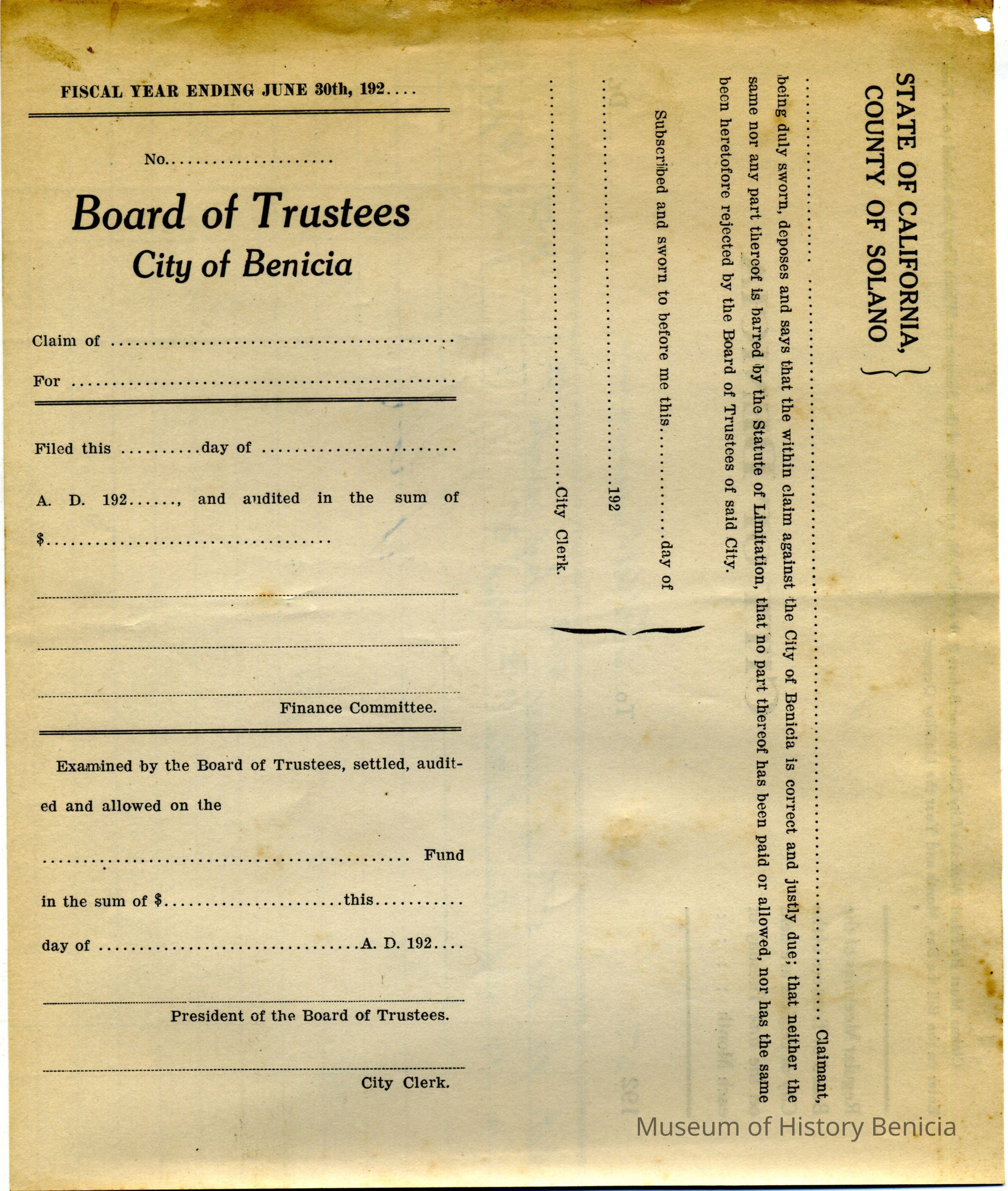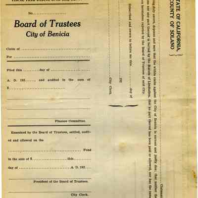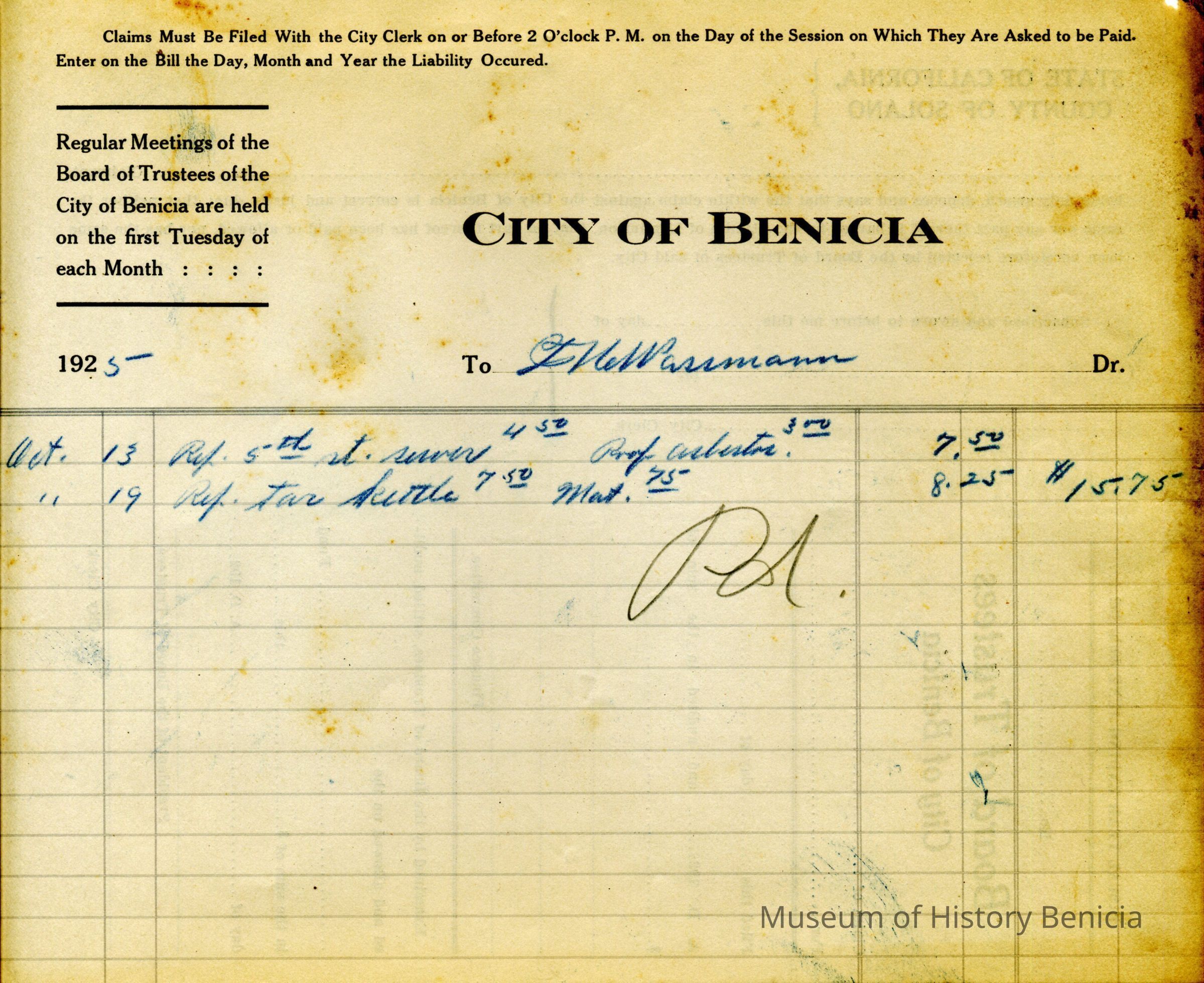 This is a claim against the City of Benicia by Wassmann Plumbing for work done in 1925. It is on the claim form used by the City at the time.