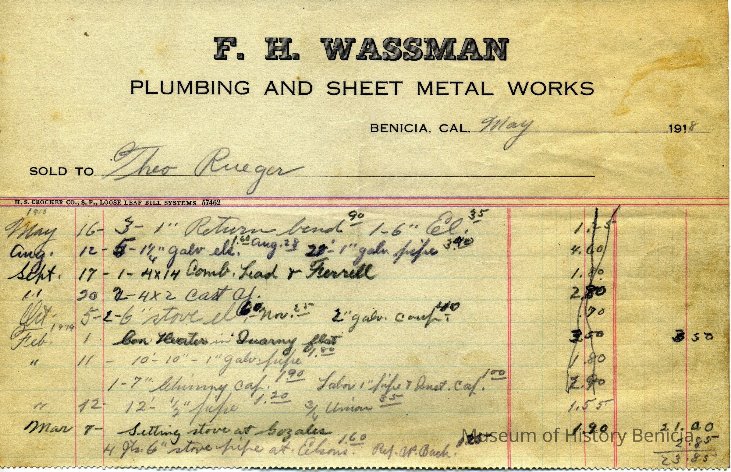 This is a billing statemaent from Frank H. Wassmann to Theodore Rueger for work done in May 1918.