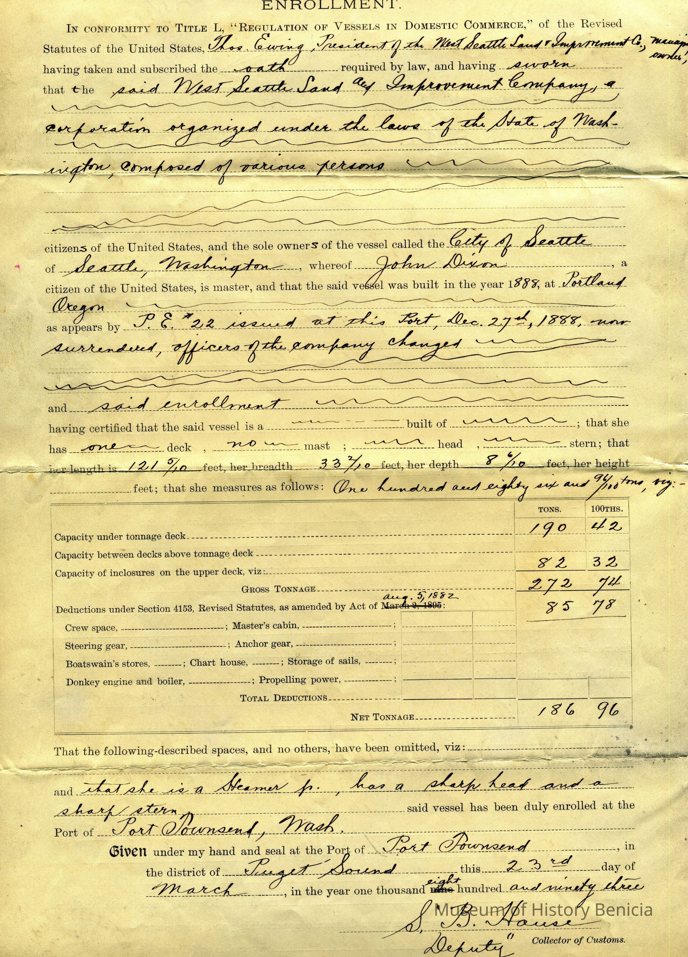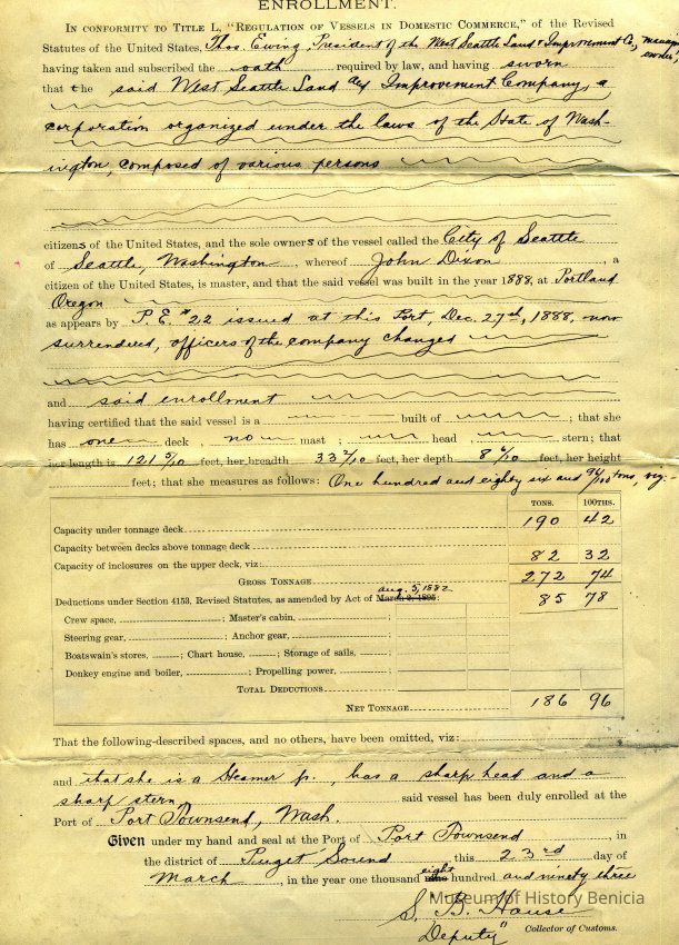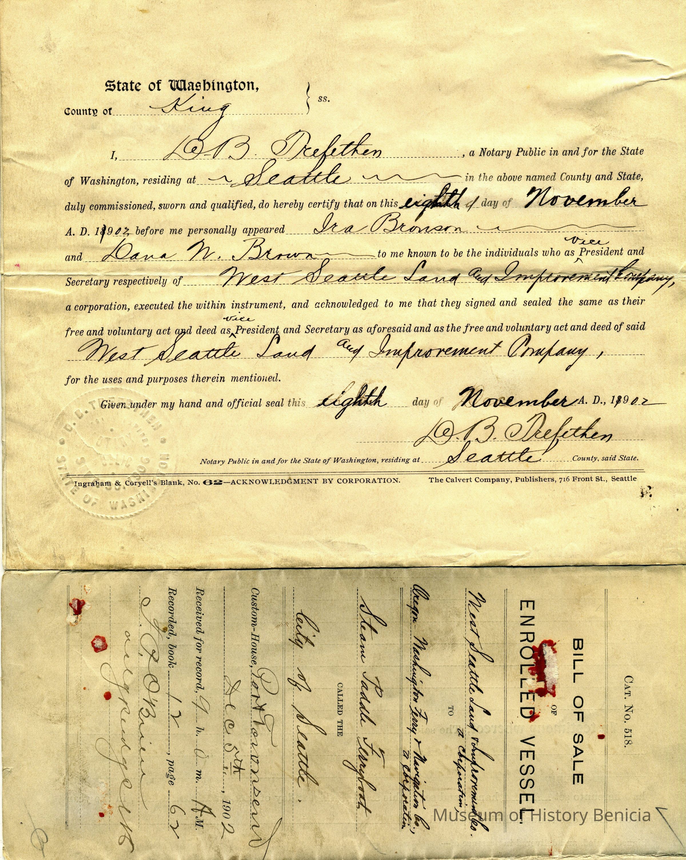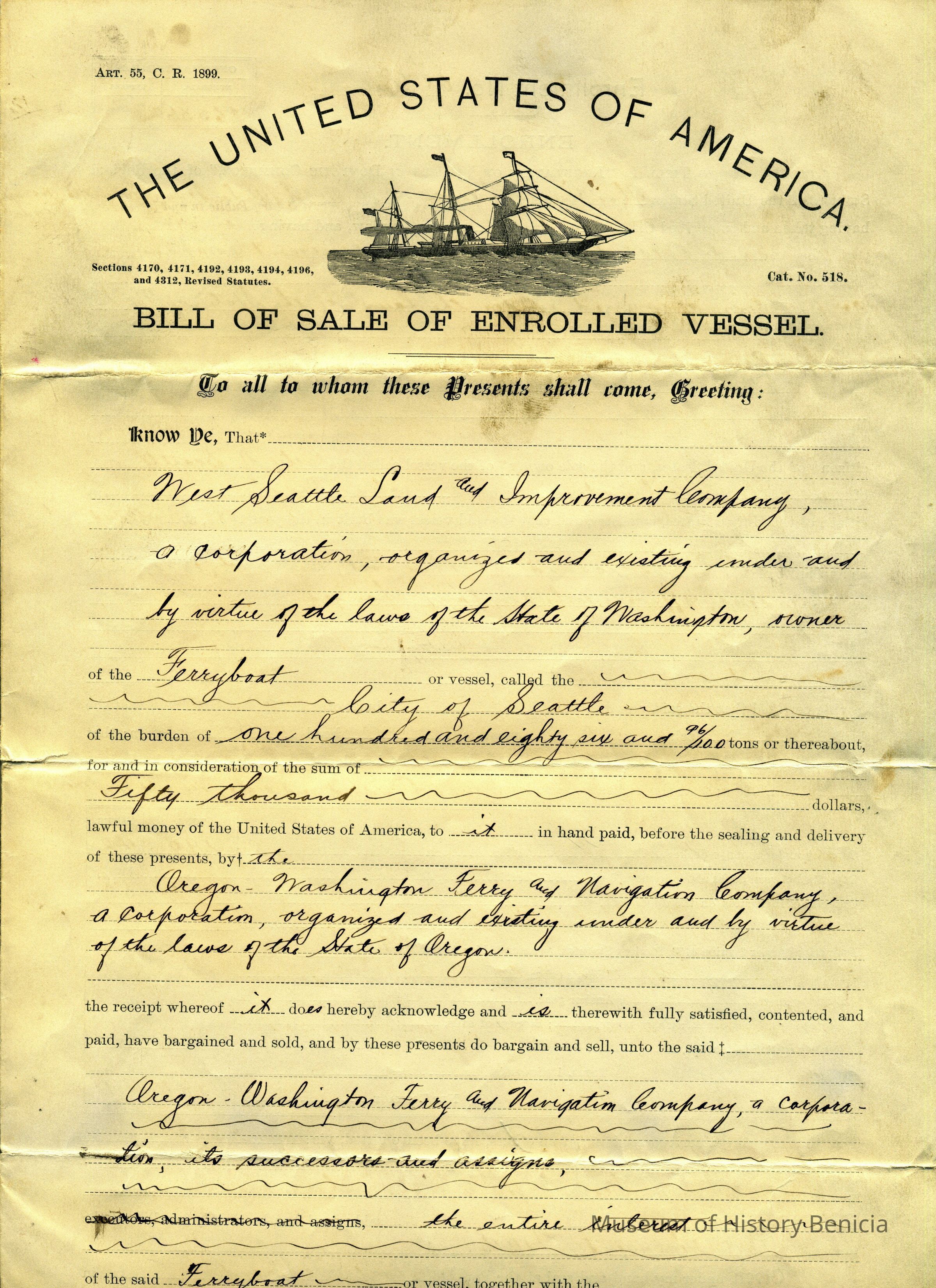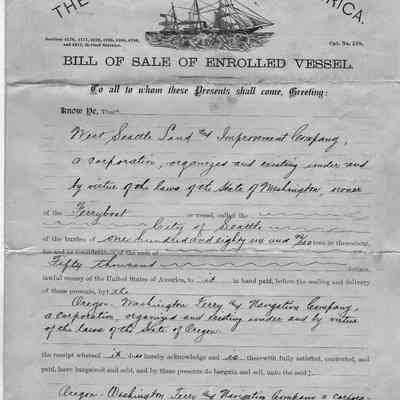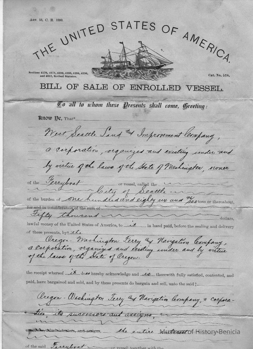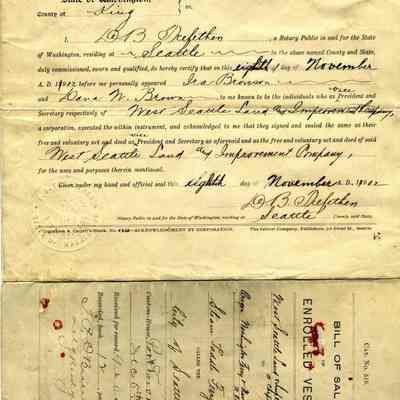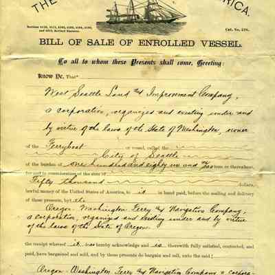 Bill-of-sale of the Steam Paddle Ferryboat 'City of Seattle.' Sold by the West Seattle Land and Improvement Co. to the Oregon-Washington Ferry and Navigation Co. Dated Dec. 5, 1902.