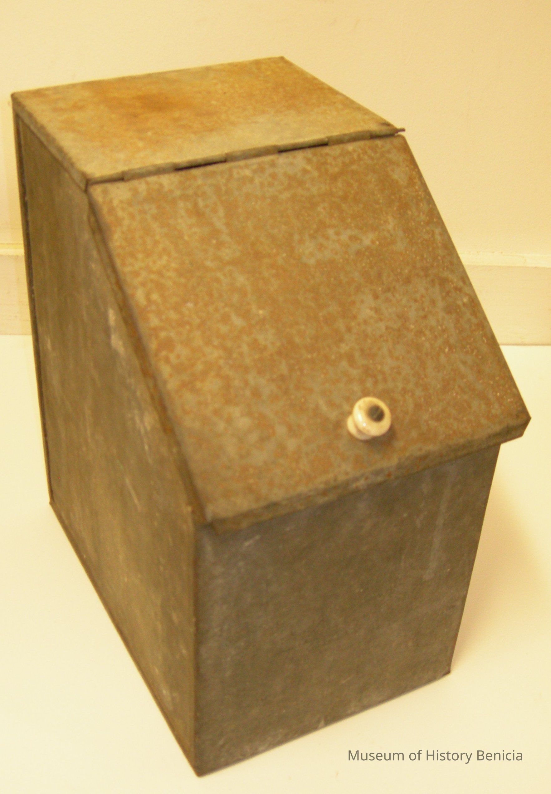 tin storage bin hinged slanted front lid, porcelain knob