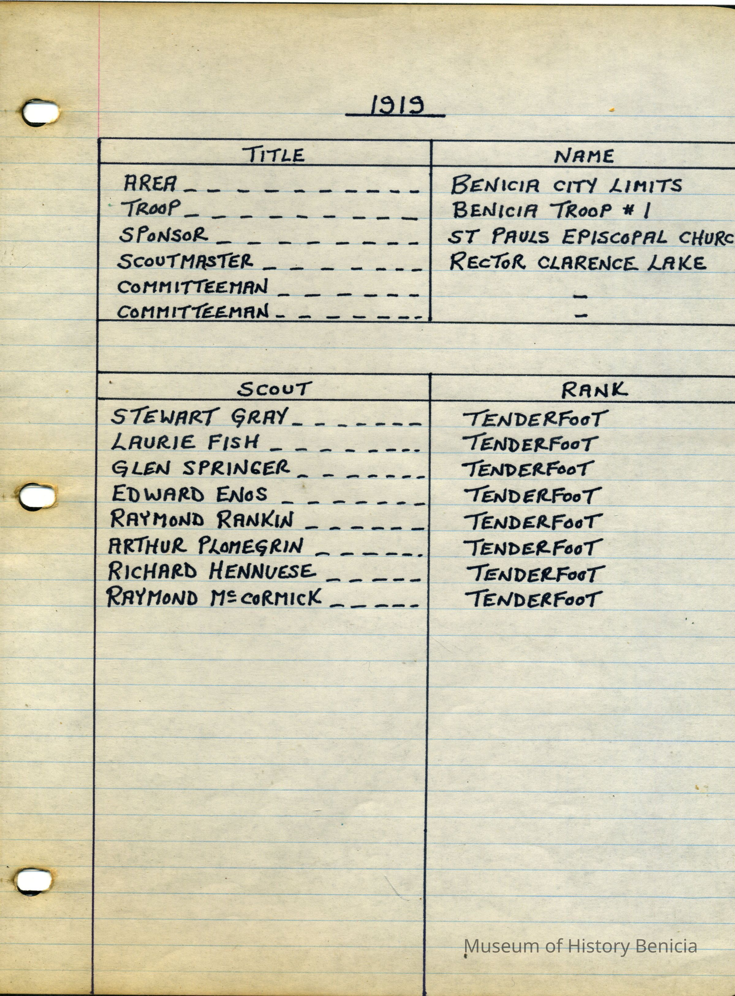 Binder containing lists of Boy Scouts names, ranks, scout masters from Benicia Troop 1 and Troop 7 from 1919 - 1977