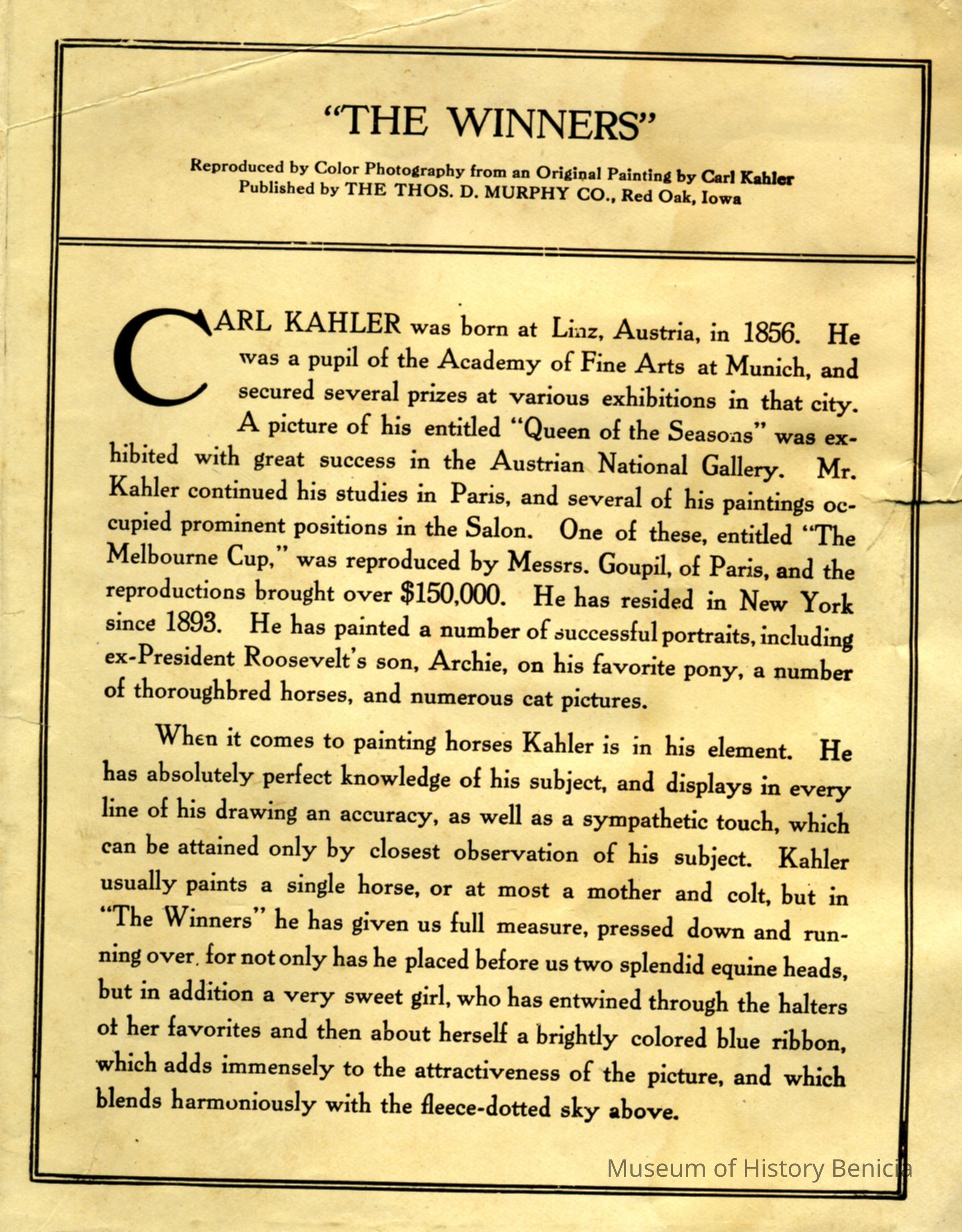This is a biography of the artist who designed the print "The Winners" which is used in the Rex Spray calendar in object # 2016.099.0069. The advertizing calendar is for Rex Spray Co.(size 6" x 9.5"). It is for 1913 and the month January is still on the months part of the calendar. It has a graphic of a girl with two horses. The artist is Carl Kahler an Austrian artist born 1856. One of his specialties was painting horses.Collection