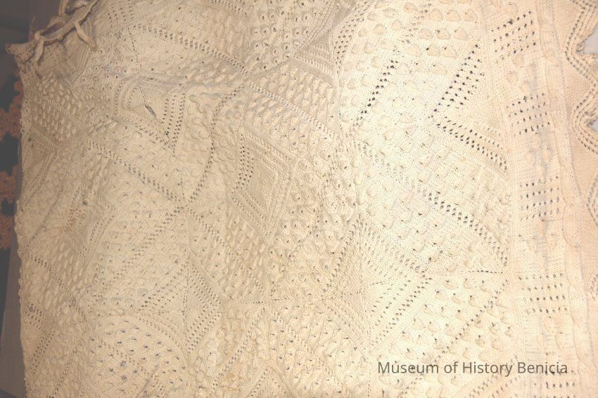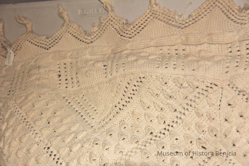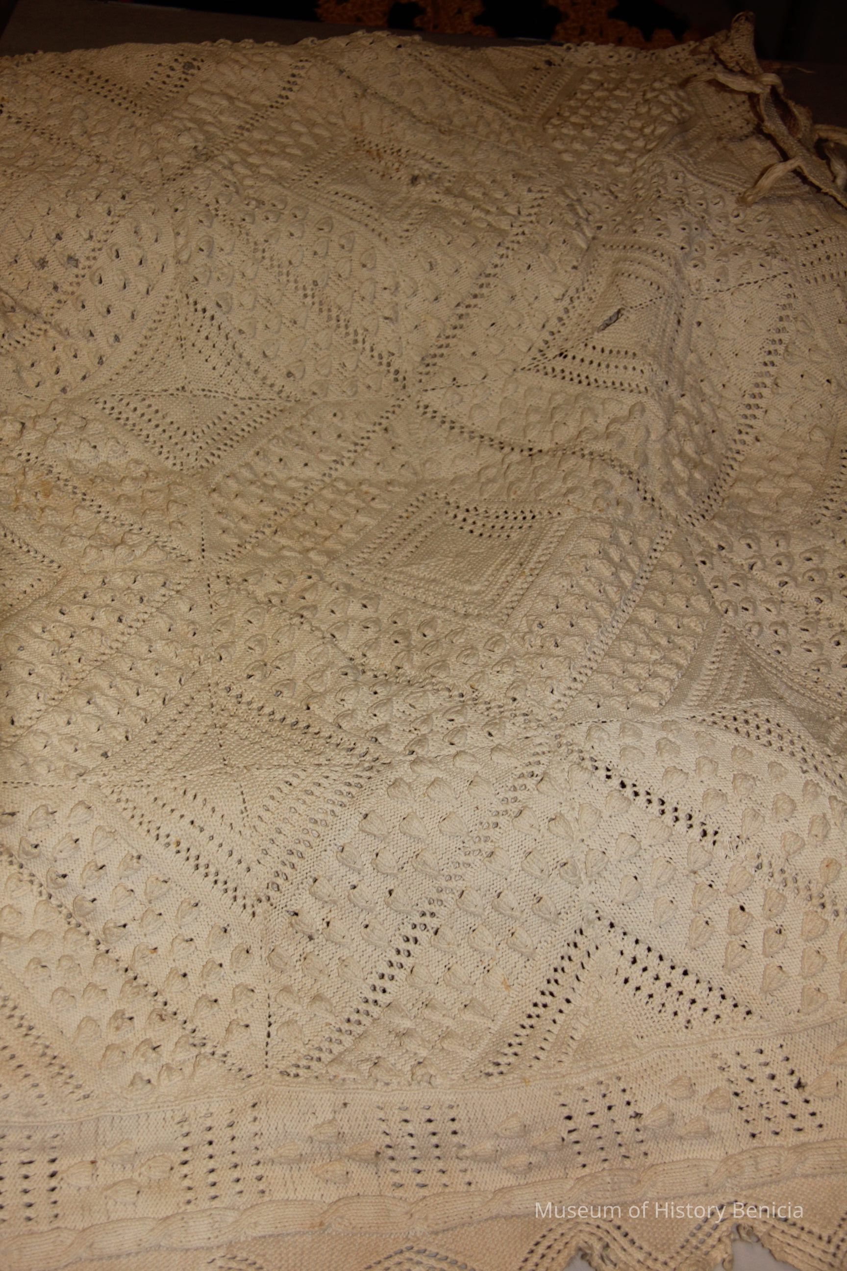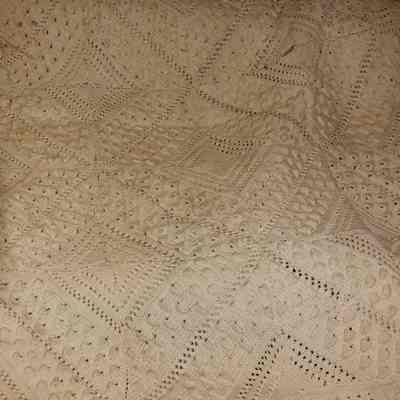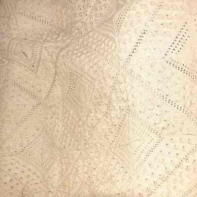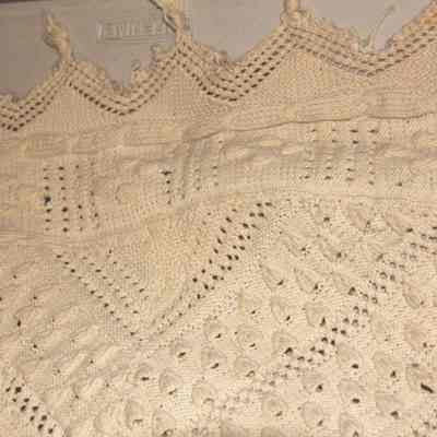 Crochet/knit blanket, ecru, scalloped edges with tassel finish.
