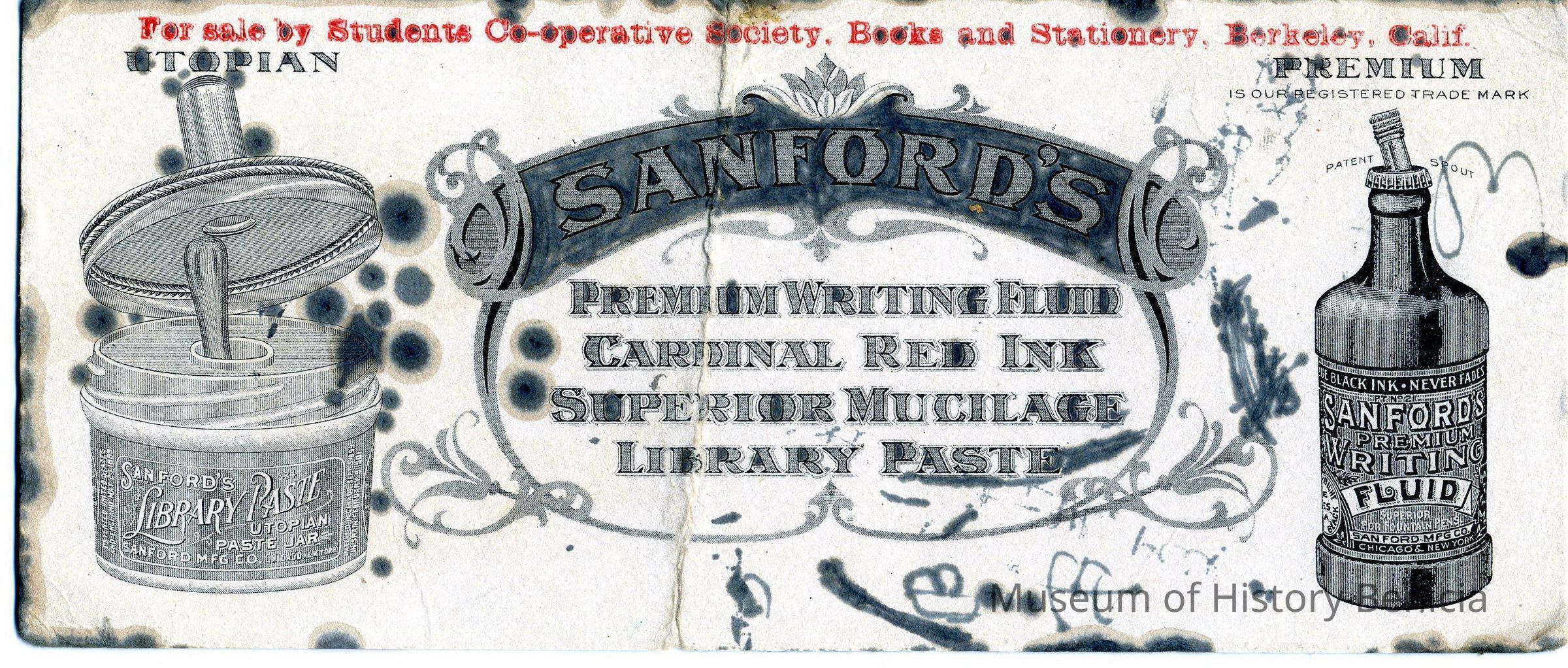 "Sanford's Premium Writing Fluid, Cardinal Red Ink, Superior Mucilage, Library Paste" along with pictures of two bottles of the product.