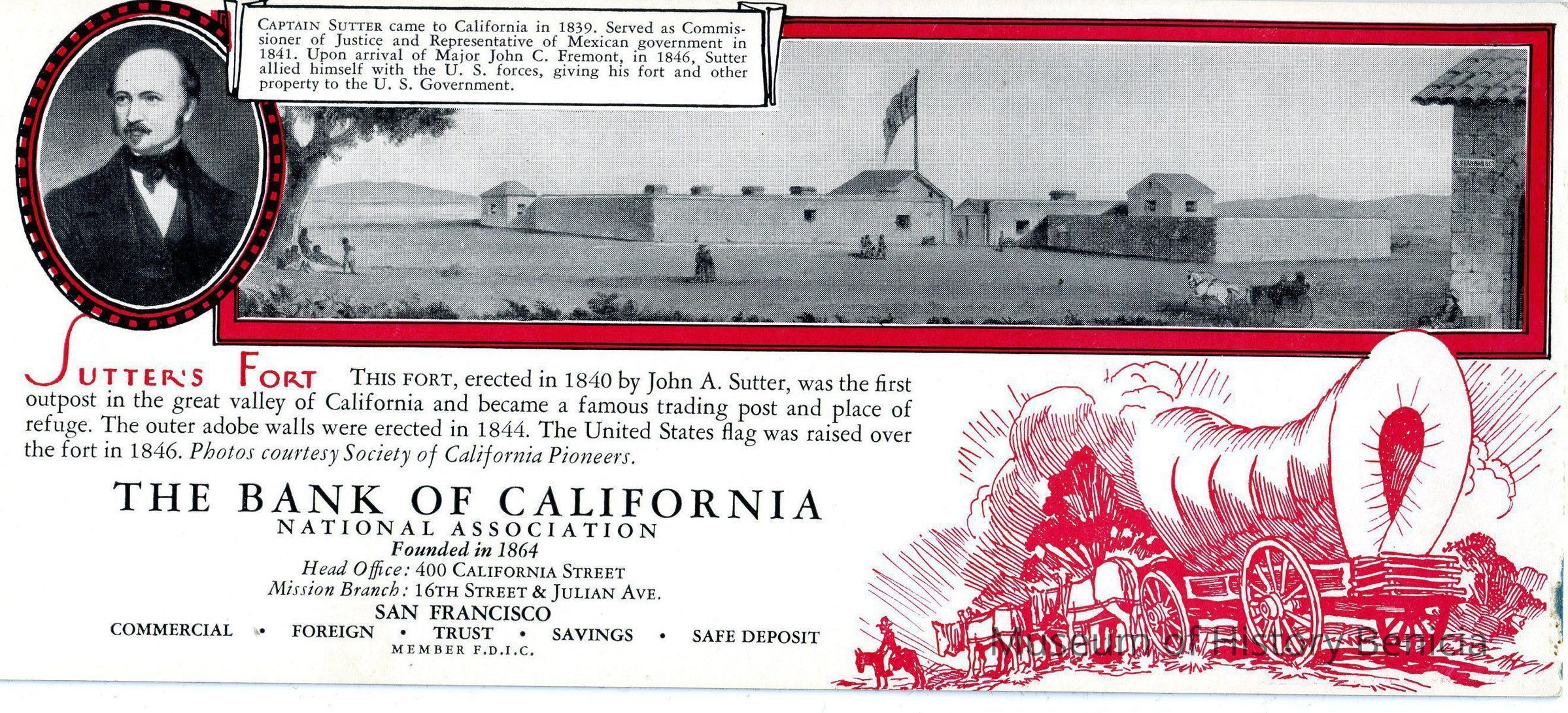 White card with black printing and photos, along with a drawing of a covered wagon and borders and "Sutter's Fort" in red