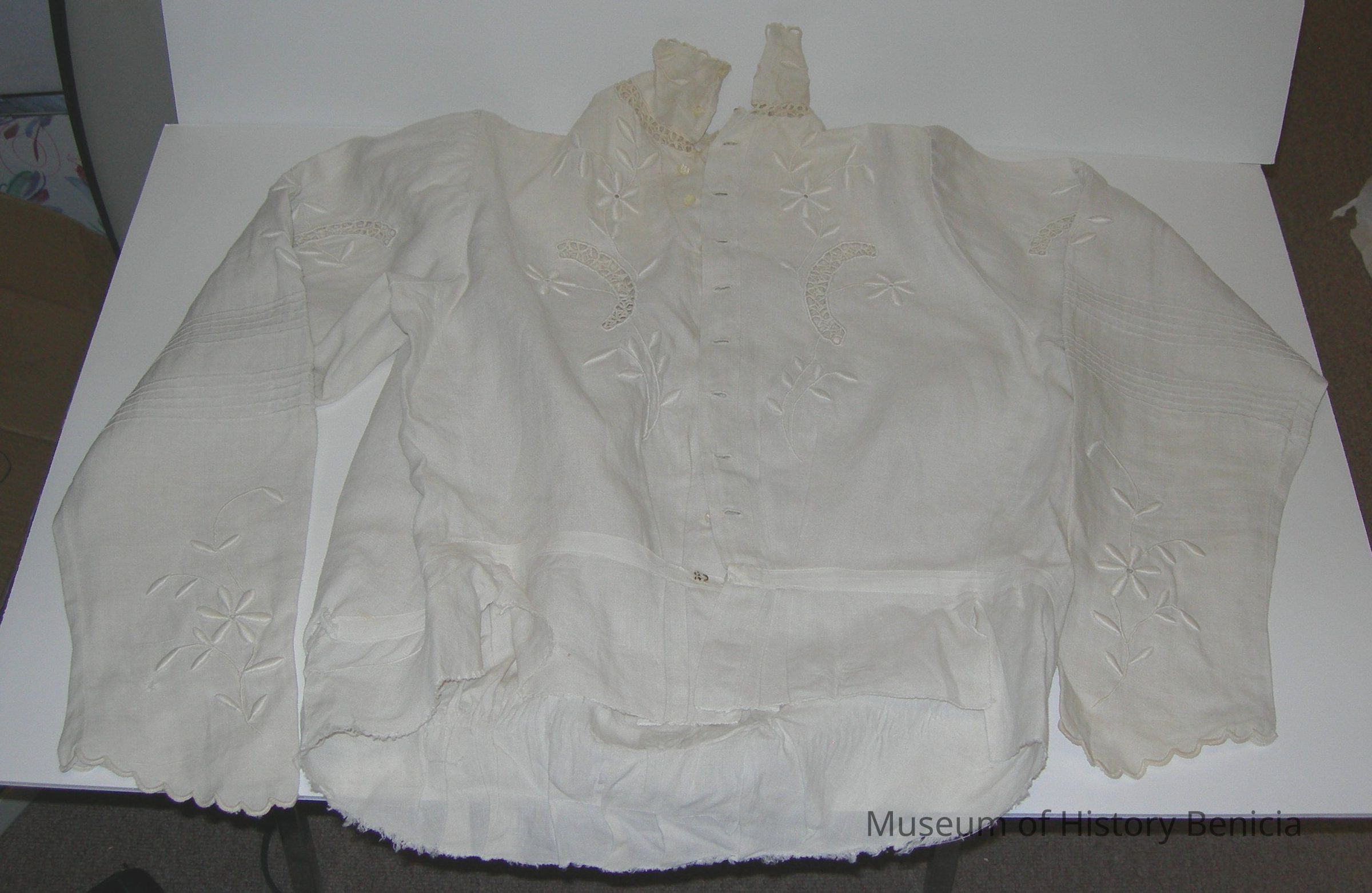 blouse: 24" sleeves with gathers at top of set in scalloped sleeve edge; 10 pearl type buttons, gathered waist with hook/eye unfinished hem, to be tucked into skirtCollection