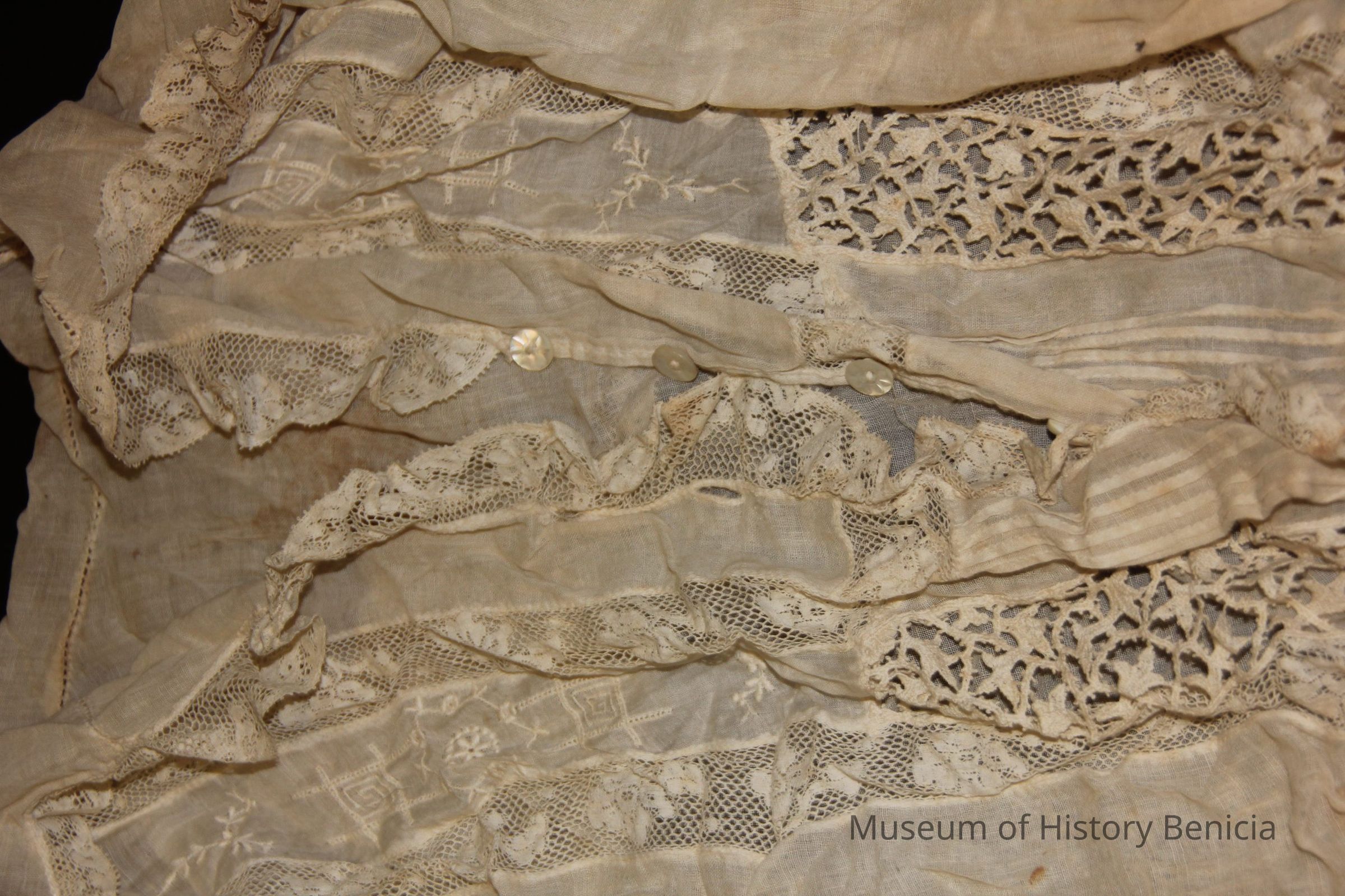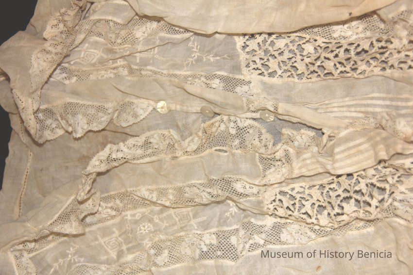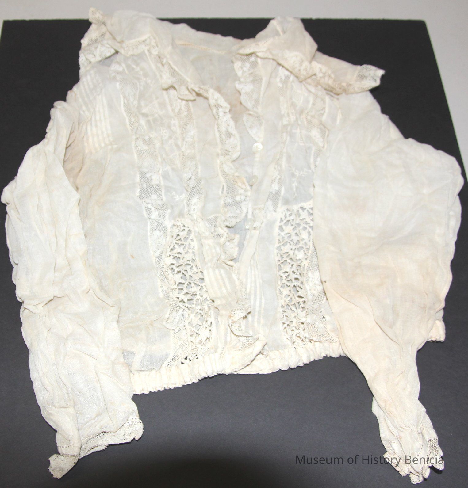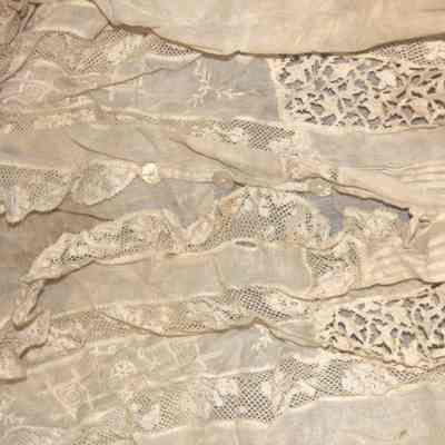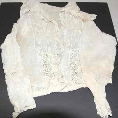 Blouse off white gauzy cotton (?) with lace trimmed sailor style collar and lace insets ; button front ; long sleeves with lace cuffs ; encased elastic waistband.