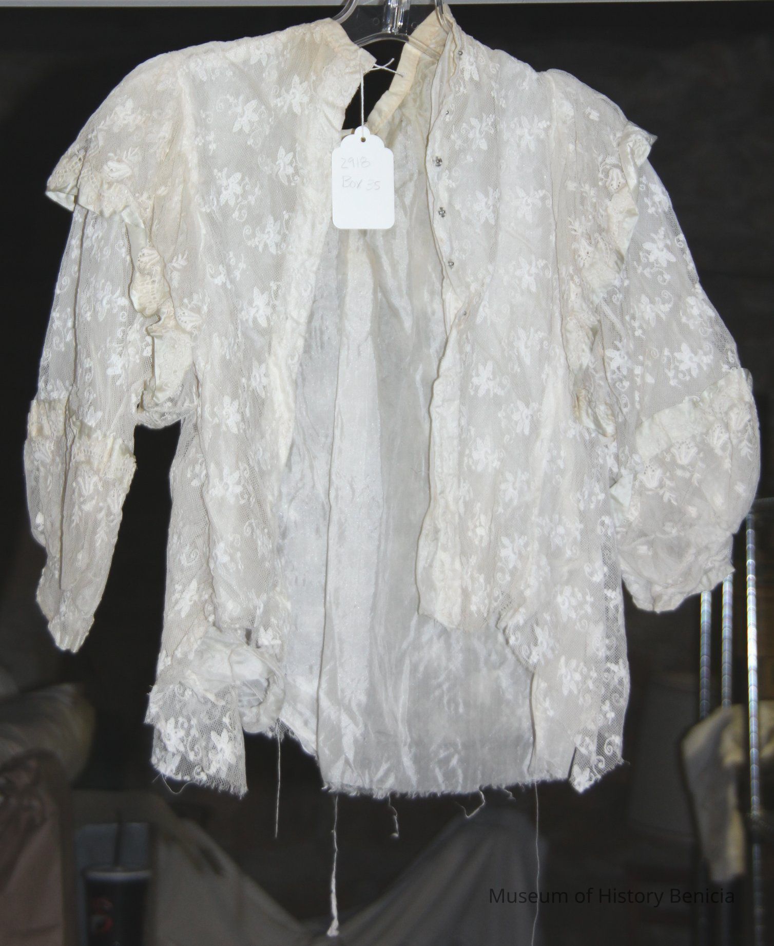 Blouse - white Victorian, lace shell with blue silk ribbon trim and silk linning no hem snap closure in back.