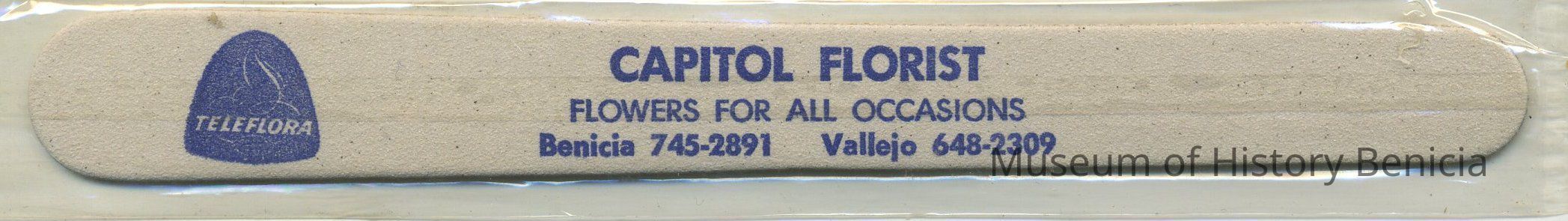 Advertising Emeryboard - "Capitol Florist / Flowers For All Occasions / Benicia 745-2891 - Vallejo 648-2309" blue ink on white; 5" long x 5/8" wide (in cellophane wrapper)Collection