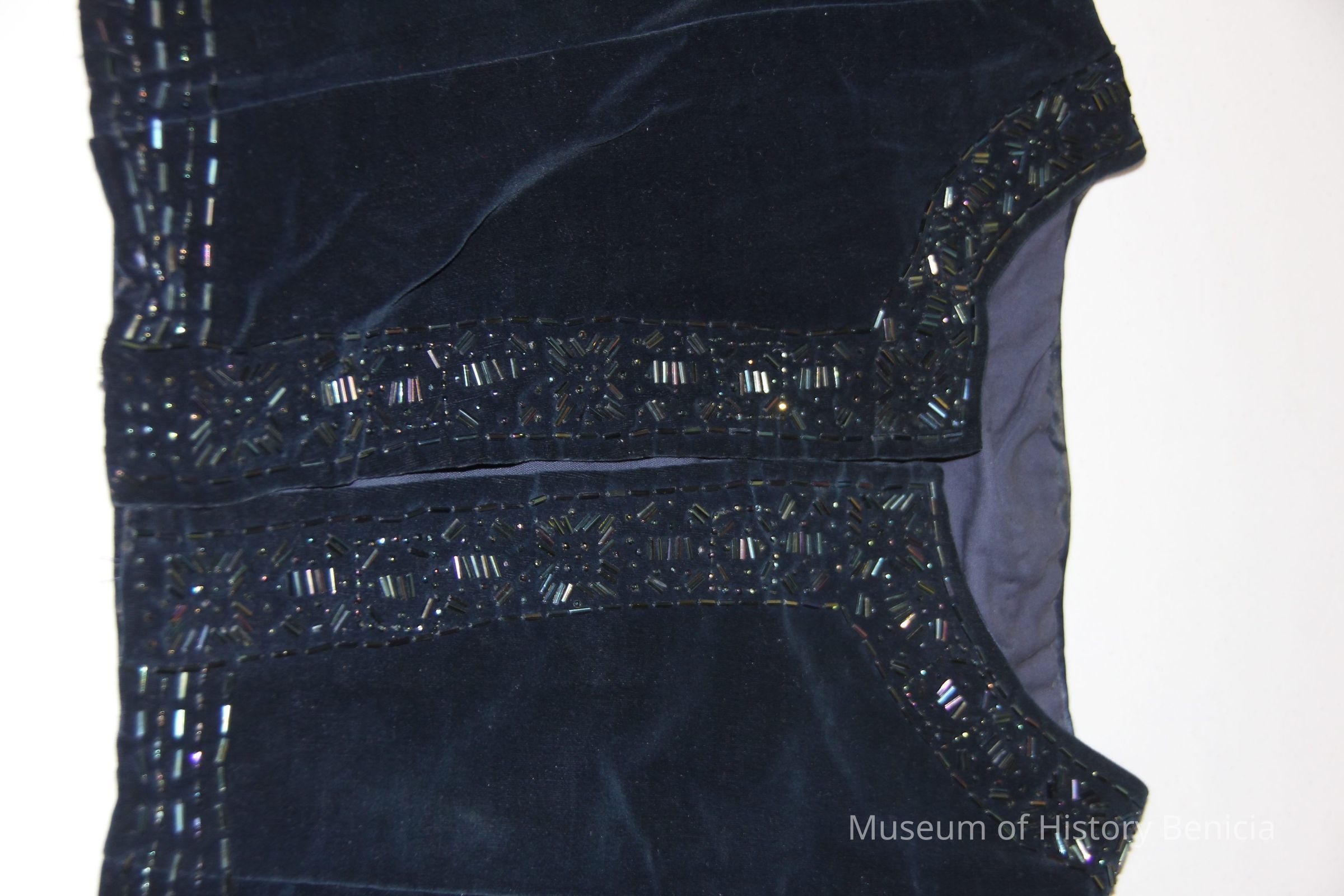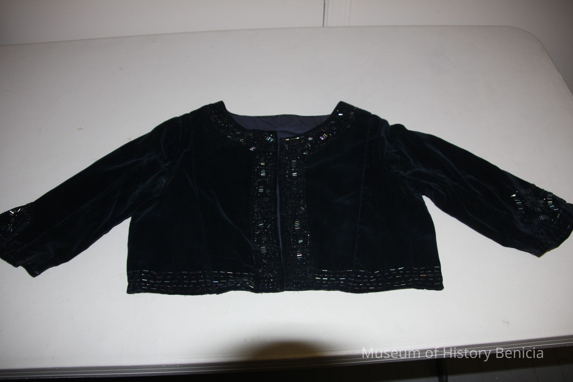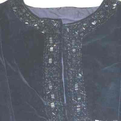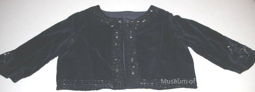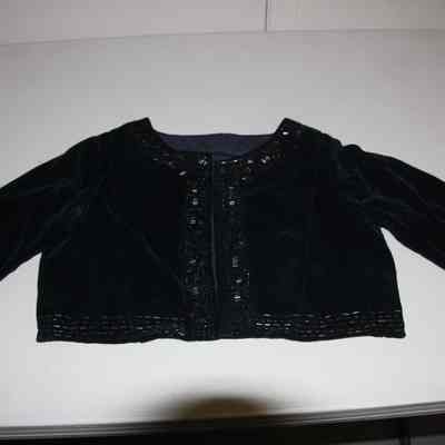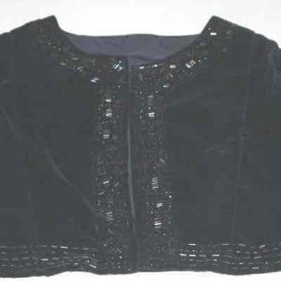 Navy blue dress bolero with beaded trim.