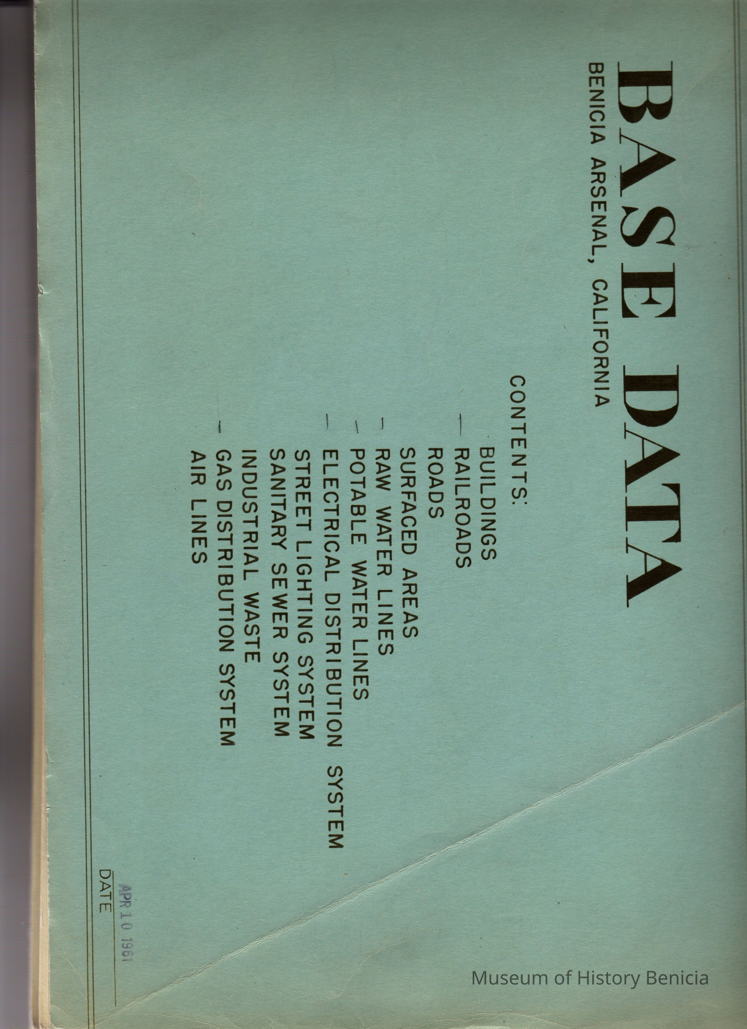 Base Data book- Arsenal colors of cover are green background with black printing; contents: Buildings, railroads, roads, surfaced areas, raw water lines, portable water lines, Electrical Distribution System, Street Lighting System, Sanitary Sewer System, Industrial Waste, Gas Distribution System and Air Lines.