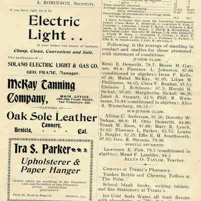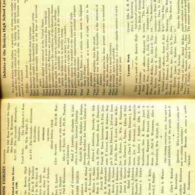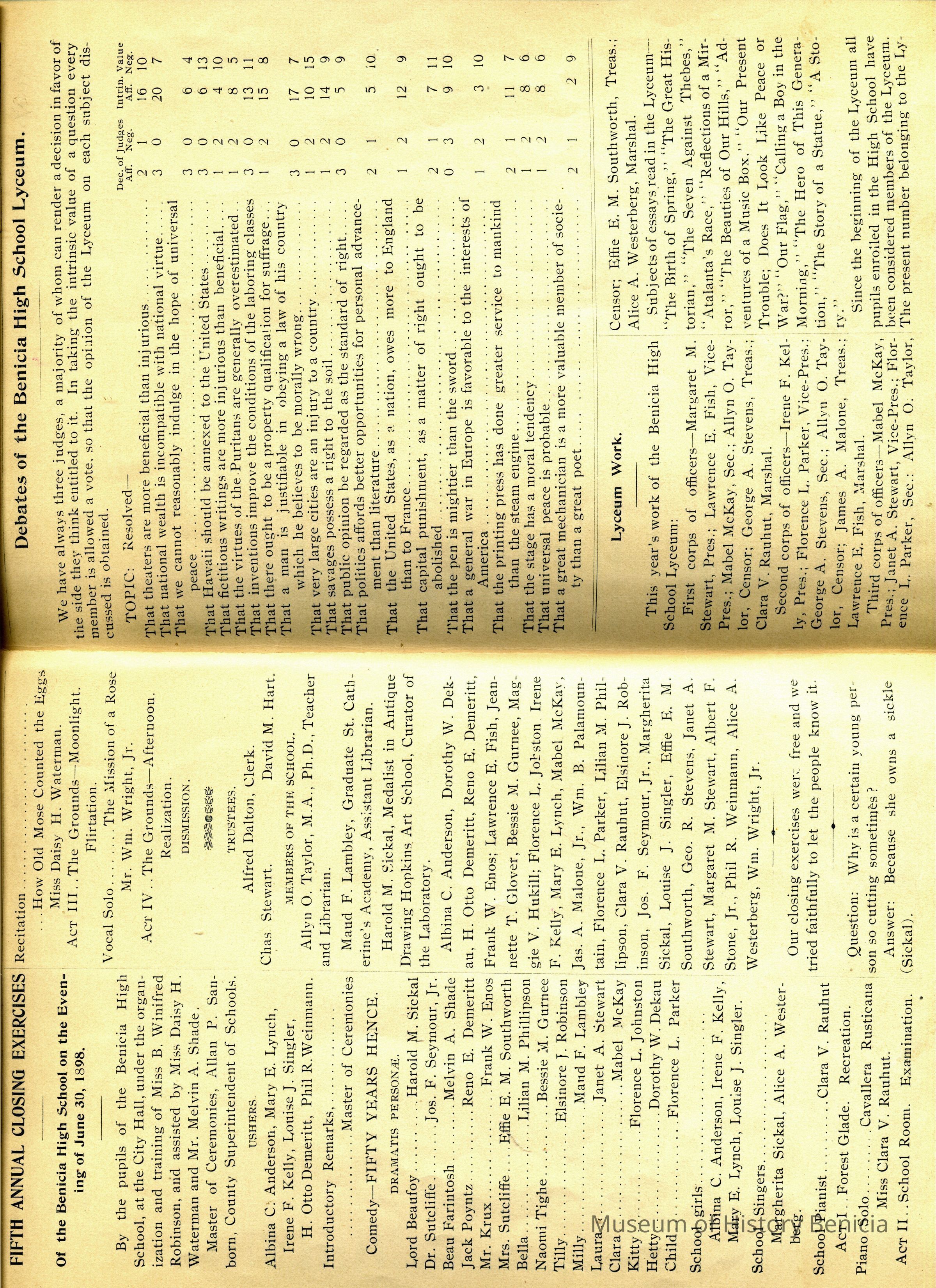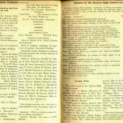 Includes: the Program of the Fifth Annual Closing Exercises of the Benicia High School on the evening of June 30, 1898; Debates / Information about / and By-Laws of the Benicia High School Lyceum; the Catalog of Books in the Benicia Public School Library; A short biography of Rev. J. H. D. Wingfield; What others have said about the students; and many advertisements from local businesses.Collection