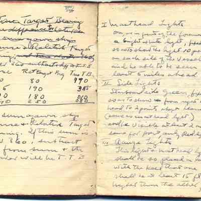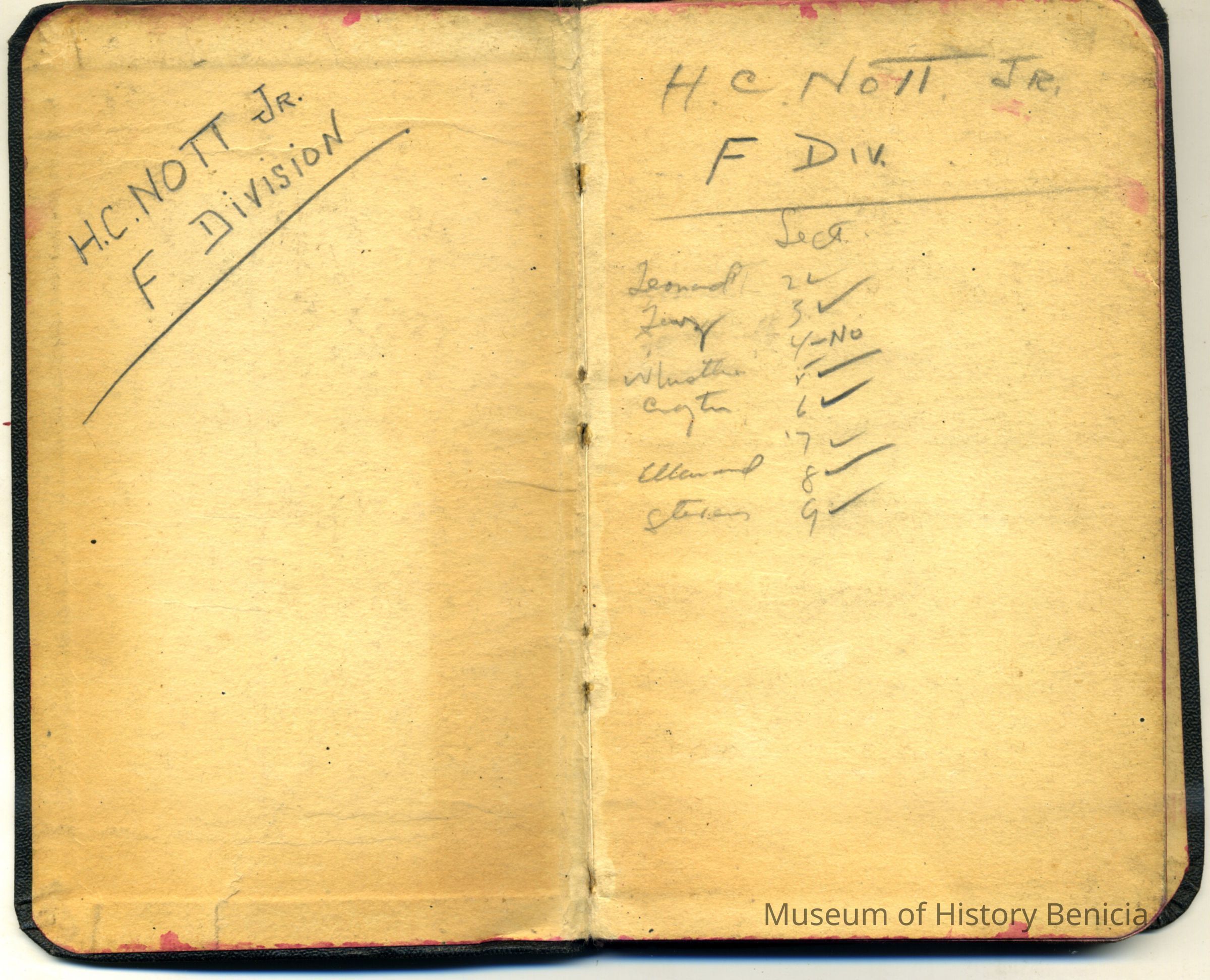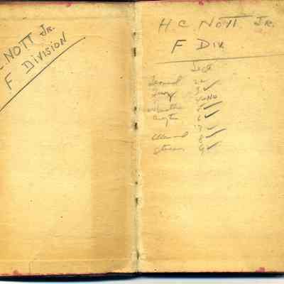 Black covered notebook with Howard C. Nott's notes. Inside he has written: H. C. Nott Jr. F Division