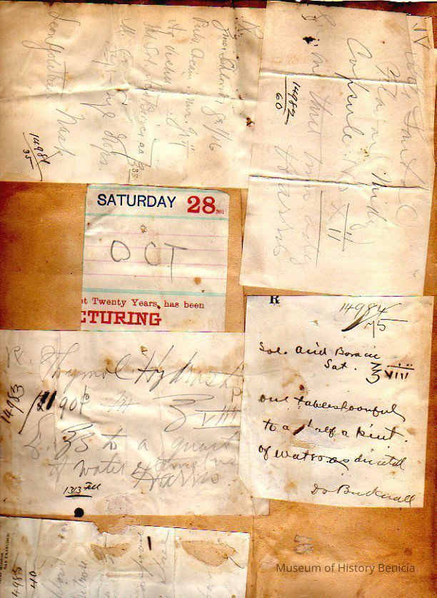 One page has a sticker from Theodore Green & Son druggists 500 Devisadero St SF, CA.