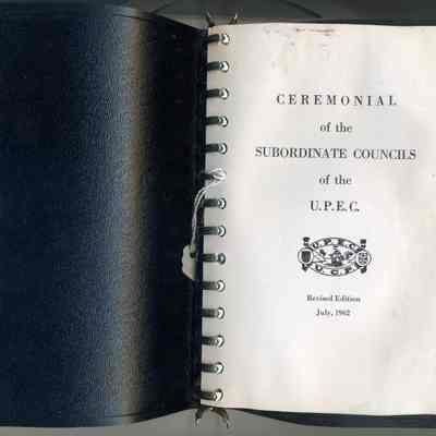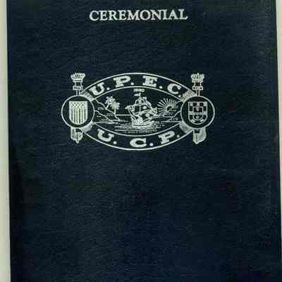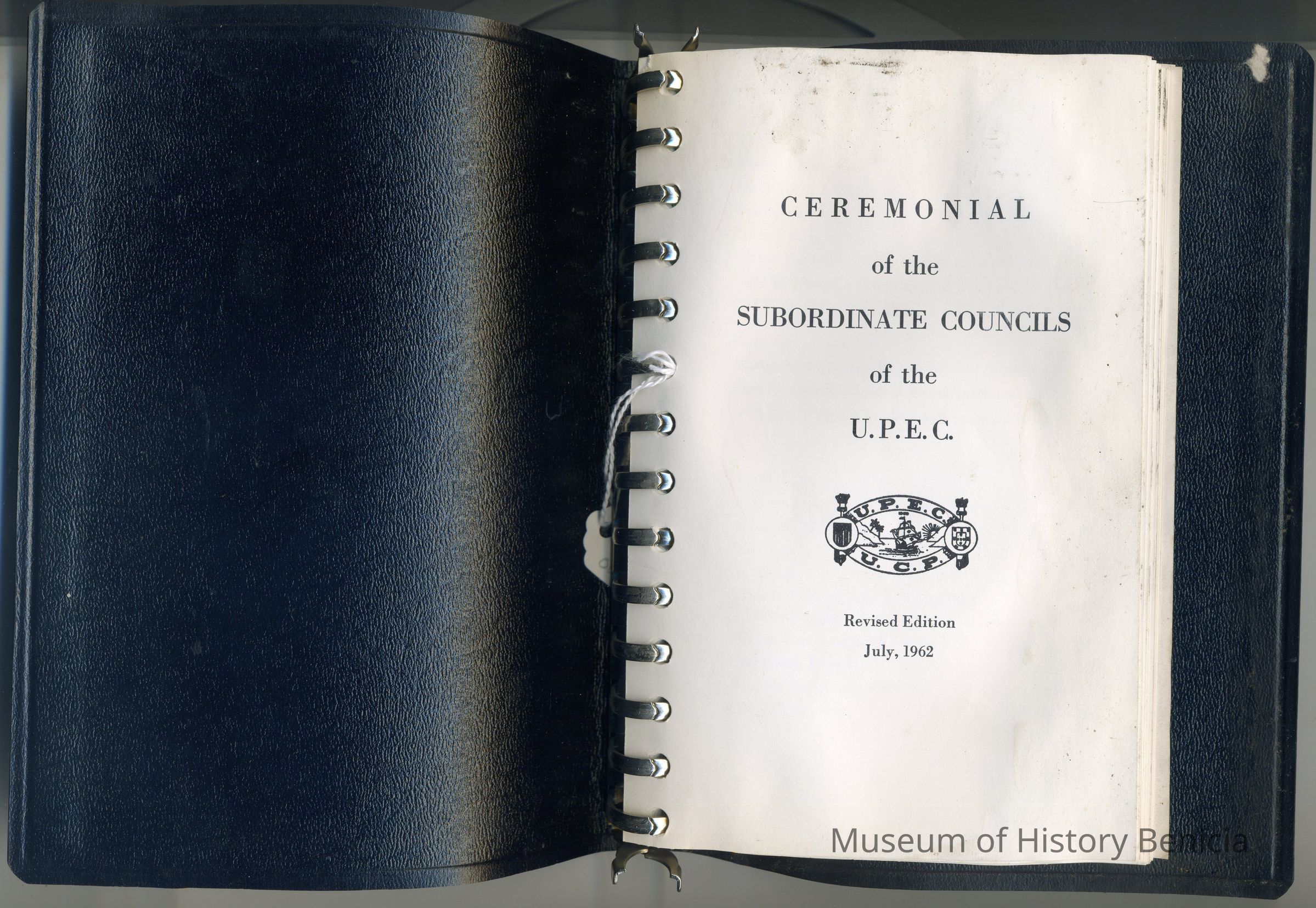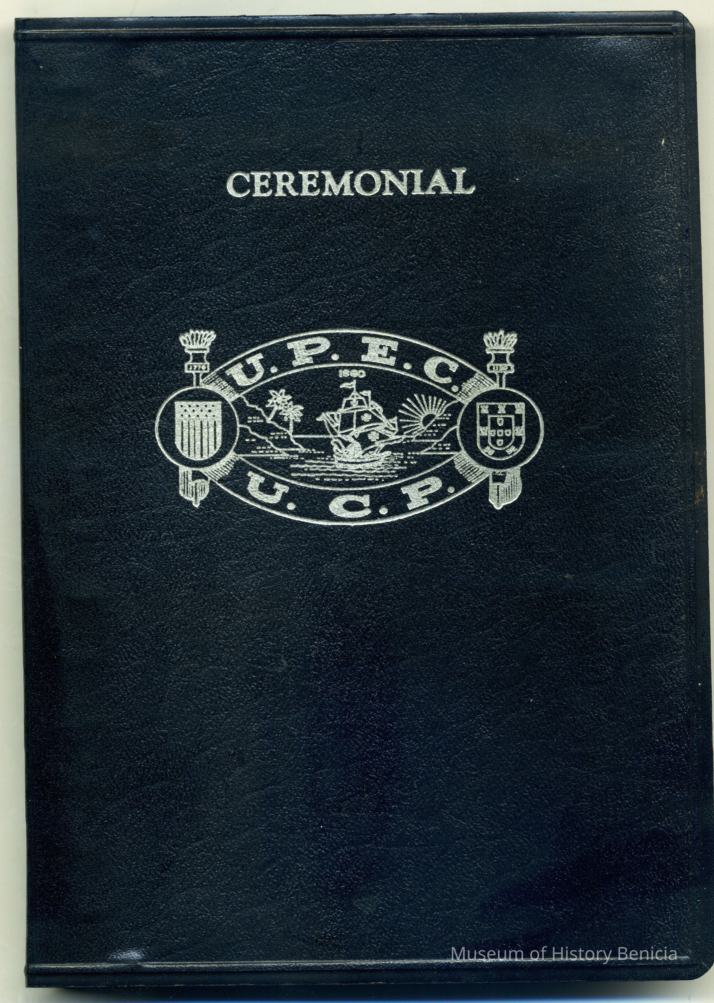 Black plastic cover, paper binder, silver lettering on cover. Ceremonial book of Uniao Portuguesa do Estado California, UPEC.