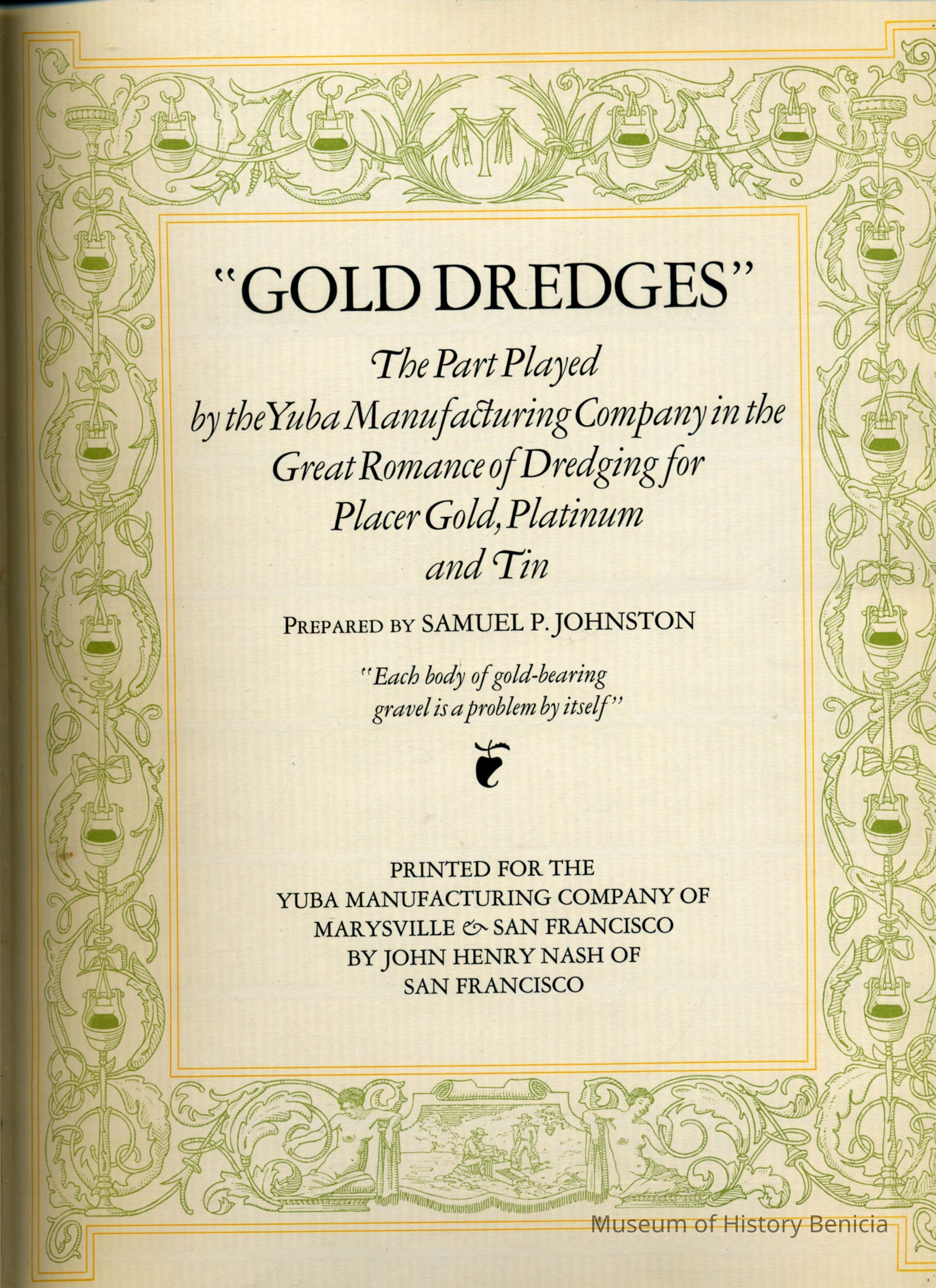 Dredger Yuba Manufacturing Co., book titled "Gold Dredgers"...tells the story of the yuba gold dredgers made at the Yuba Marysville plant. Material Prepared by Samual JohnstonCollection