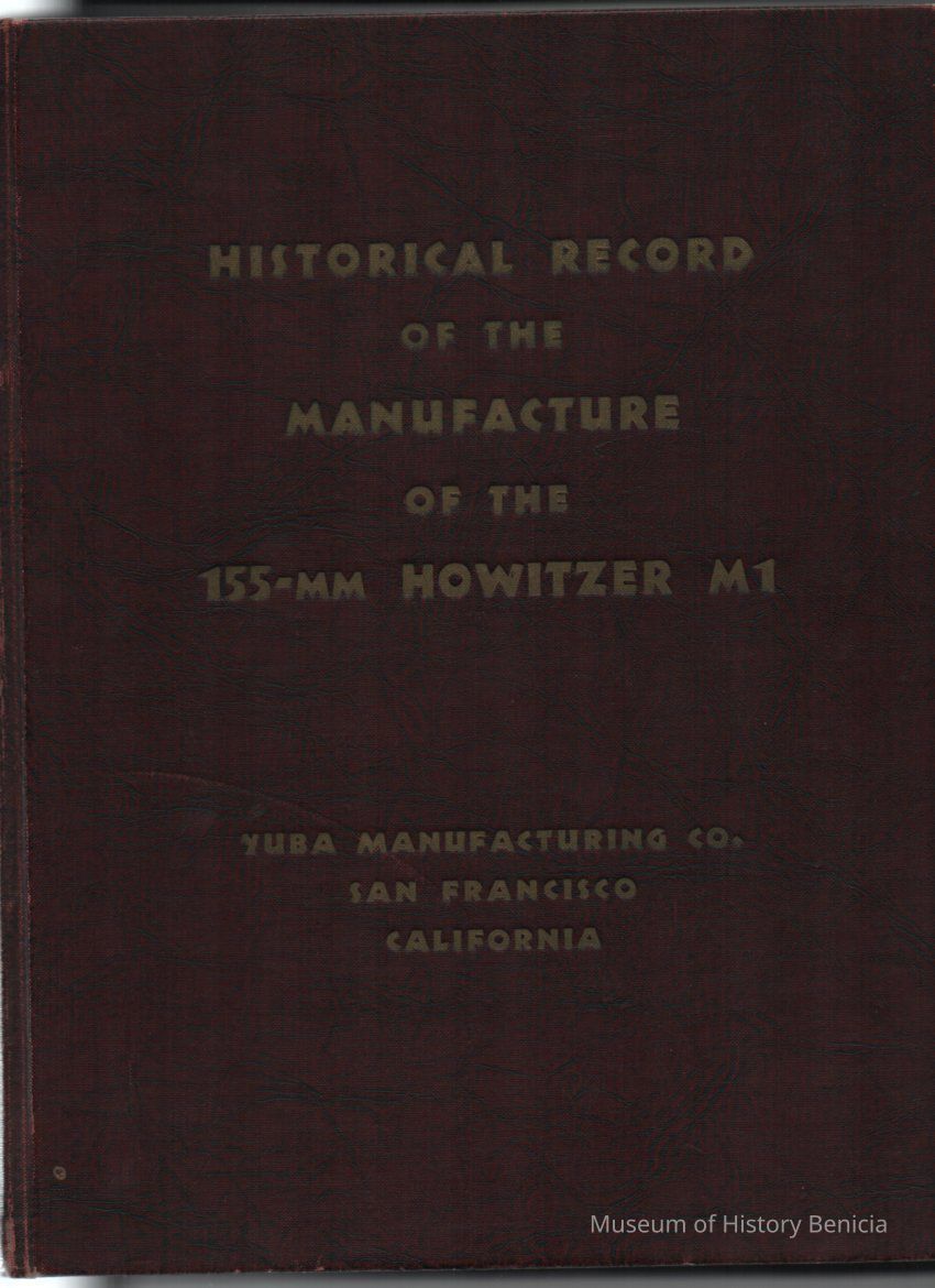 Maroon cloth hardbound book with gold lettering. "Historical Record of the Manufacturing of the 155 MM Howitzer M1" at the Benicia Yuba Plant 1942-1945. Contains details, forms, descriptions of operations, and photos. Book compiled by F. M. Blanchard, Mgr., Planning and Estimating Dept.Collection
