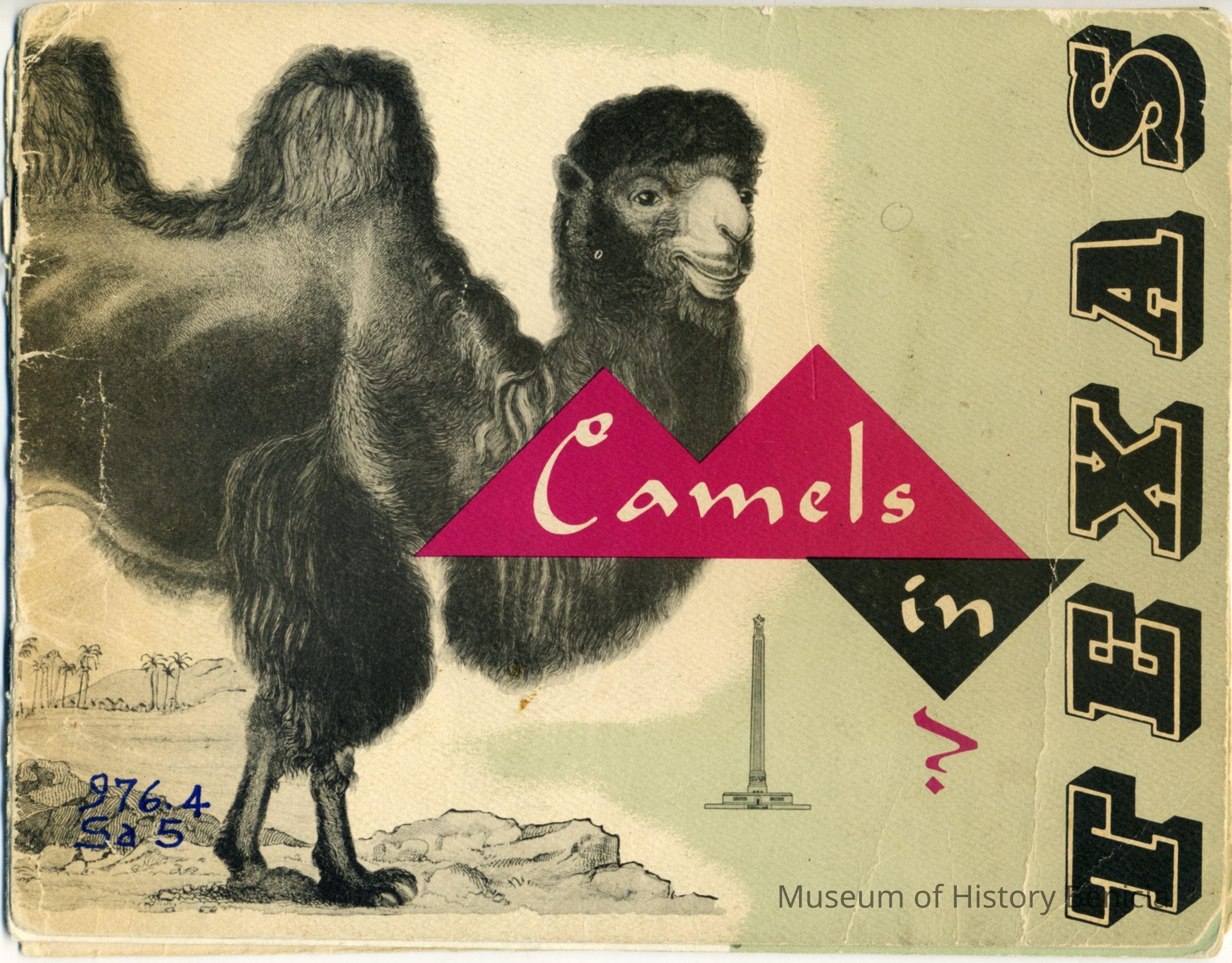 Book. "Camels in Texas" Author unknown. Published by the San Jacinto Museum of History ASsociation, San Jacinto Monument Texas, 1956.