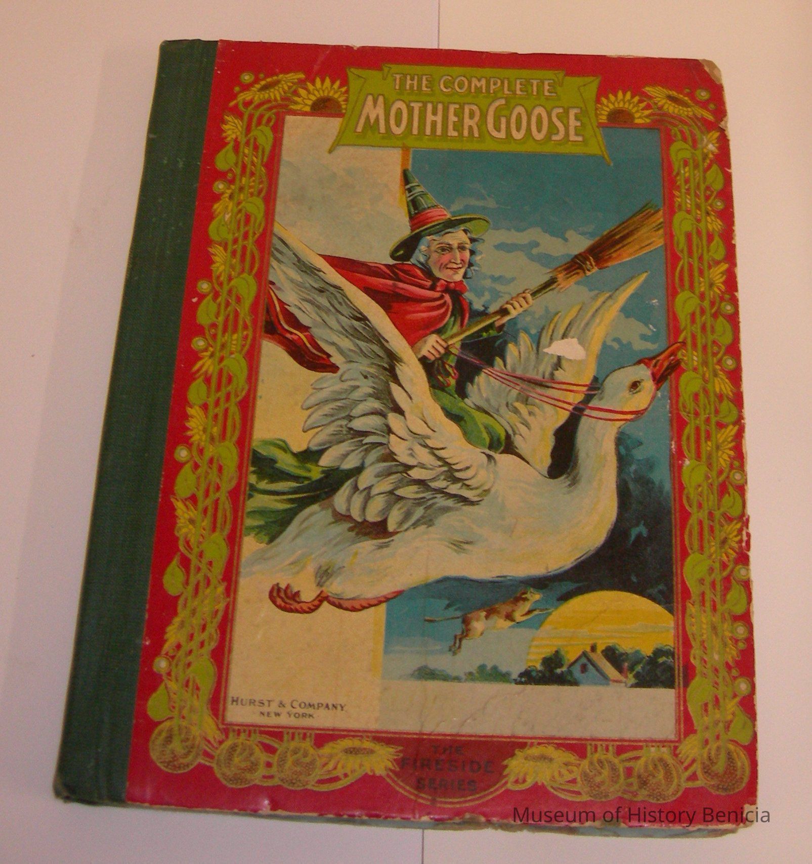 "The Complete Mother Goose," hardbound. Picture of old woman riding goose, with broom stick. "The Fireside Series." Green cloth spine. Written in pencil inside front cover: "Gerald Dana 9 years old"Collection