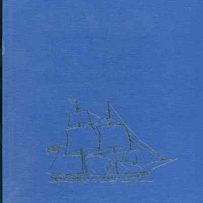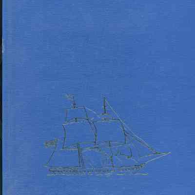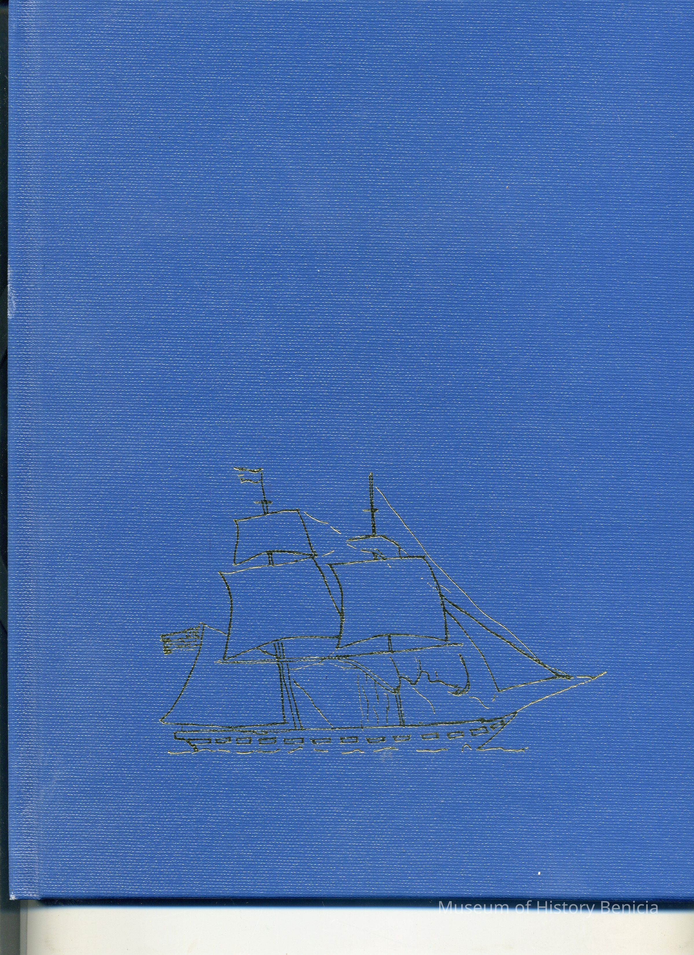 Blue hard cover book with gold sailing ship design on front. On side: "Captain Frederick William Macondray Elizabeth G. Lampen" in gold.
