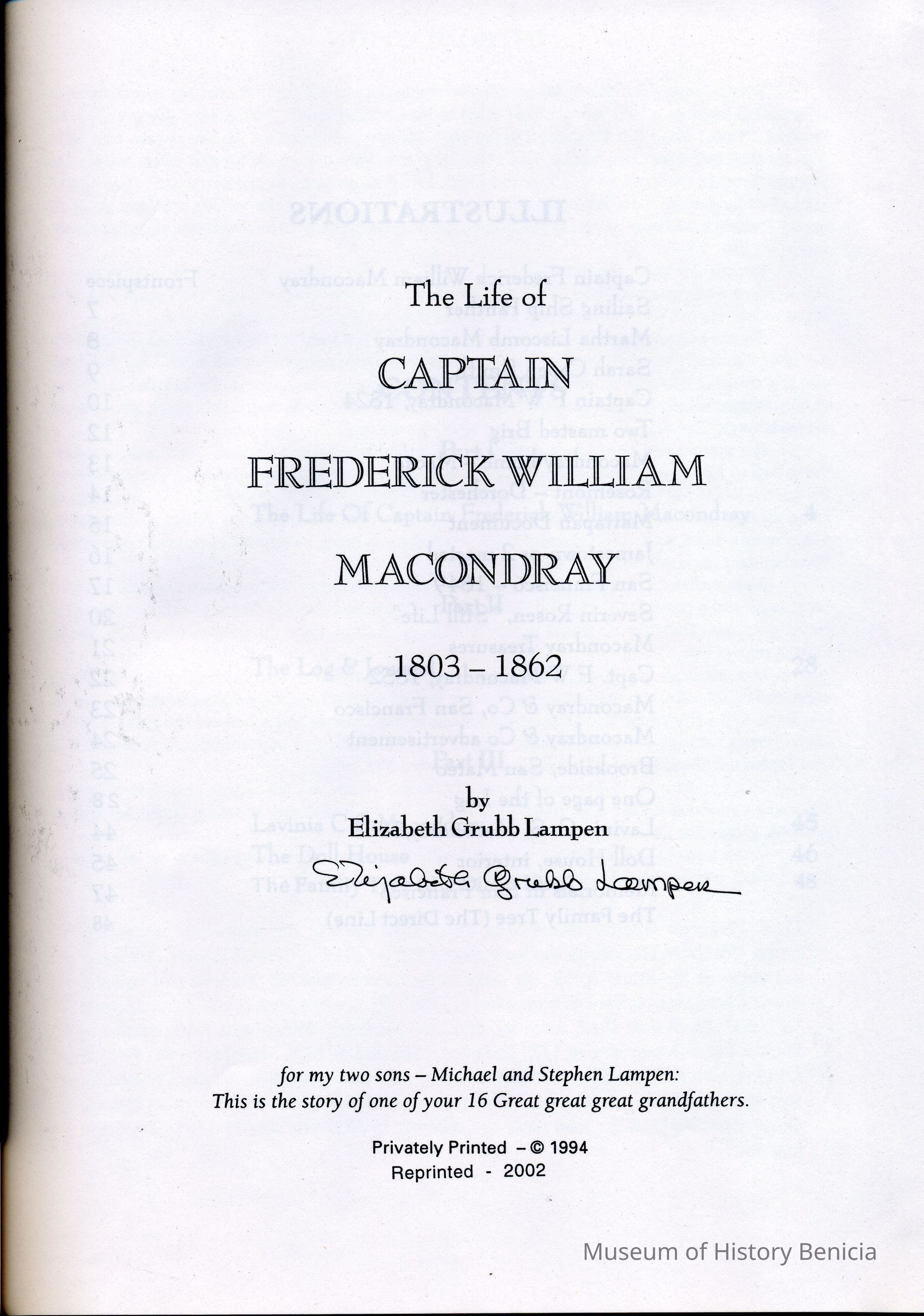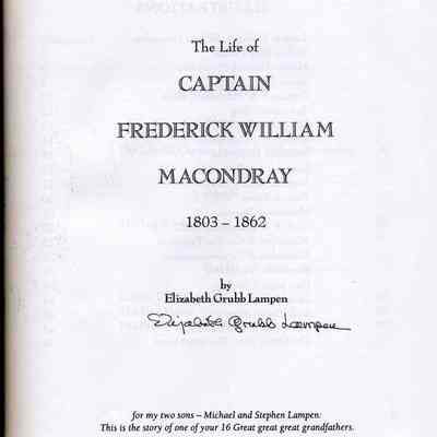 inside on title page: The Life of Captain Frederick William Macondray 1803-1862 by Elizabeth Grubb Lampen (her signature below the printing) for my two sons - Michael and Stephen Lampen: This is the story of one of your 16 Great great great grandfathers. Privately Printed - c 1994 Reprinted - 2002 (no publisher was listed)Collection