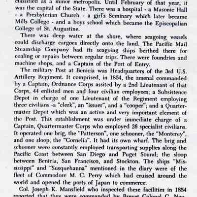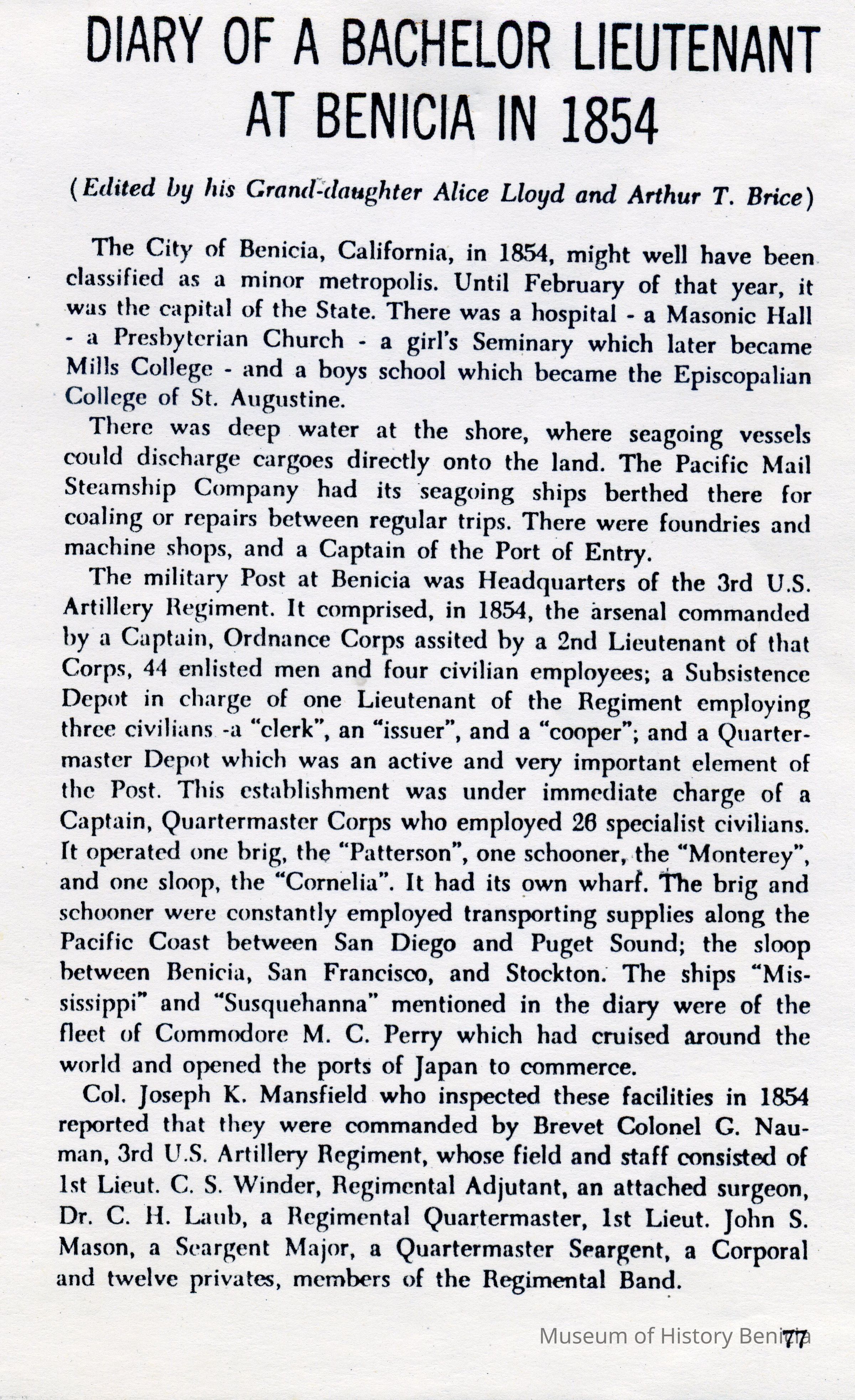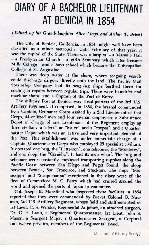 Excert of pages 77-84 from a book, Chapter titled Diary of a Bachelor Lieutenant at Benicia in 1854. Below chapter name is "Edited by his Grand-daughter Alice Lloyd and Arthur T. Brice" This a copy of original.Collection