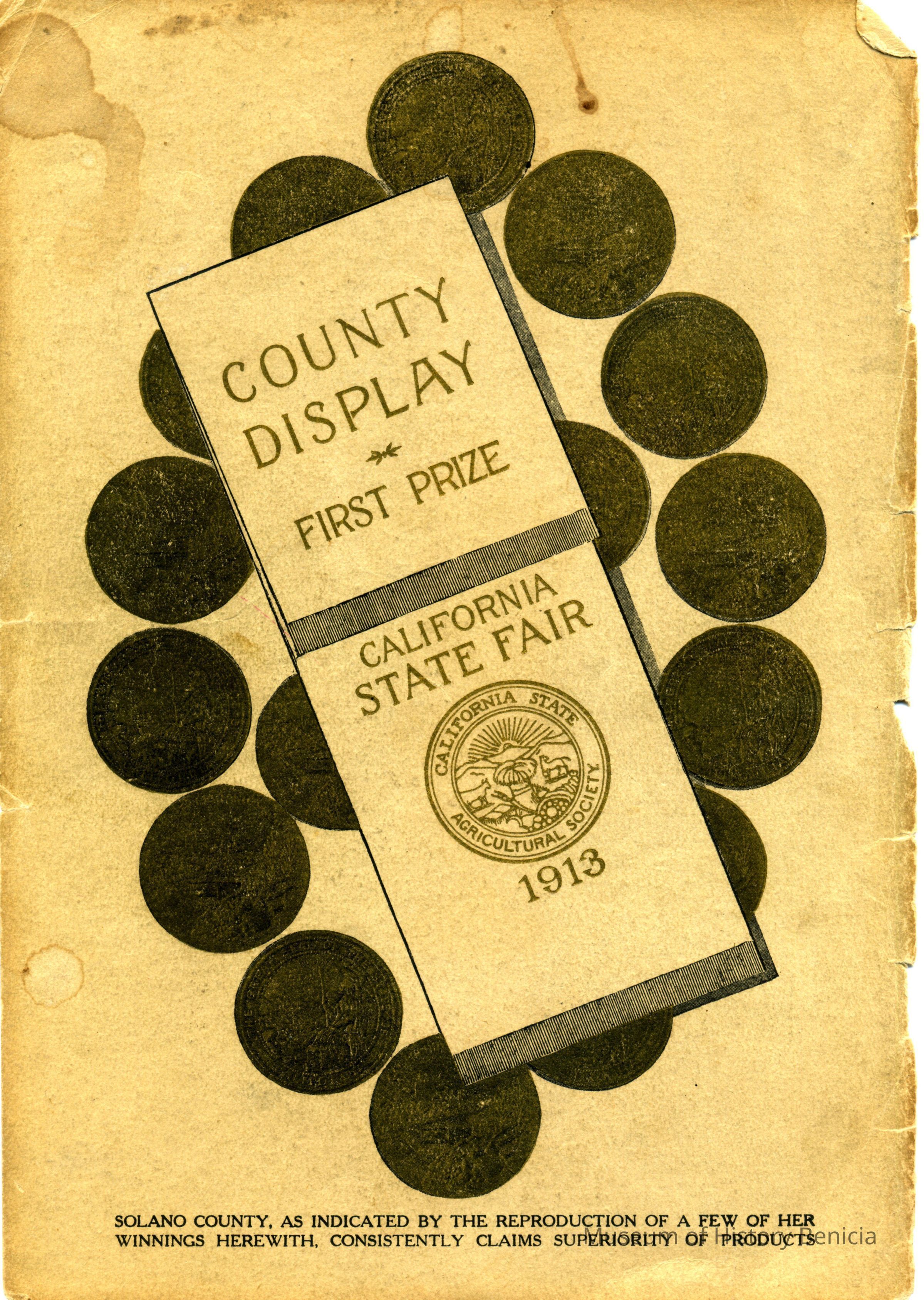 This looks like the cover of a booklett advertising Solano County in the 1913 California State Fair. There is a seal for the California State Agricultural Society and several depictions of medals That Solano County has won at previous fairs.Collection