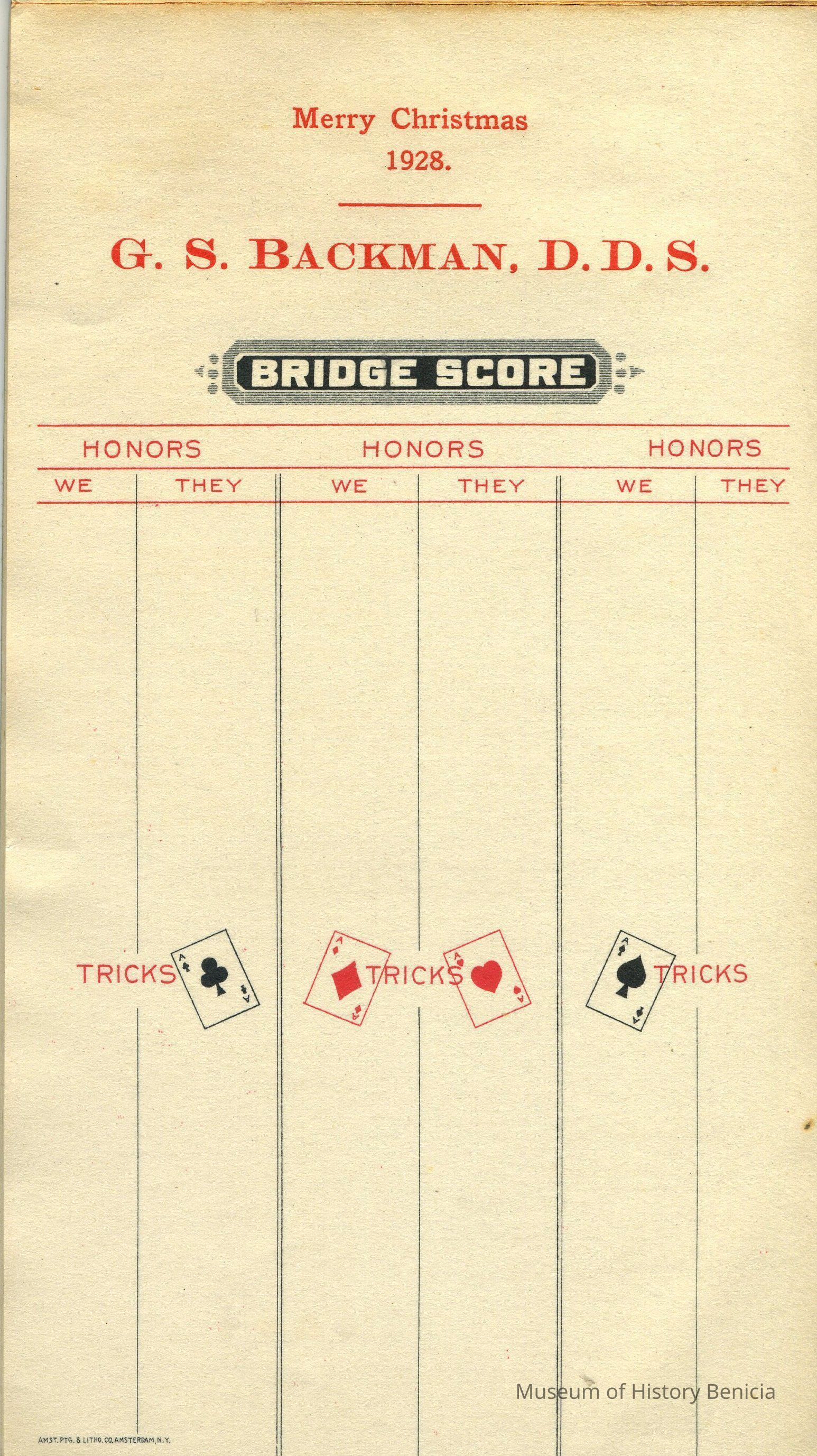 Inside are pages for keeping score in bridge games. It is unknown where Dr. Backman had his practice.