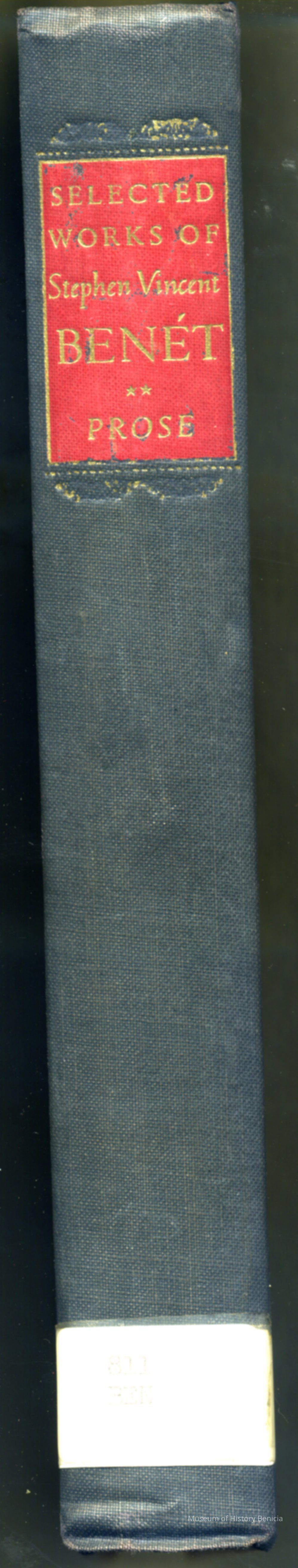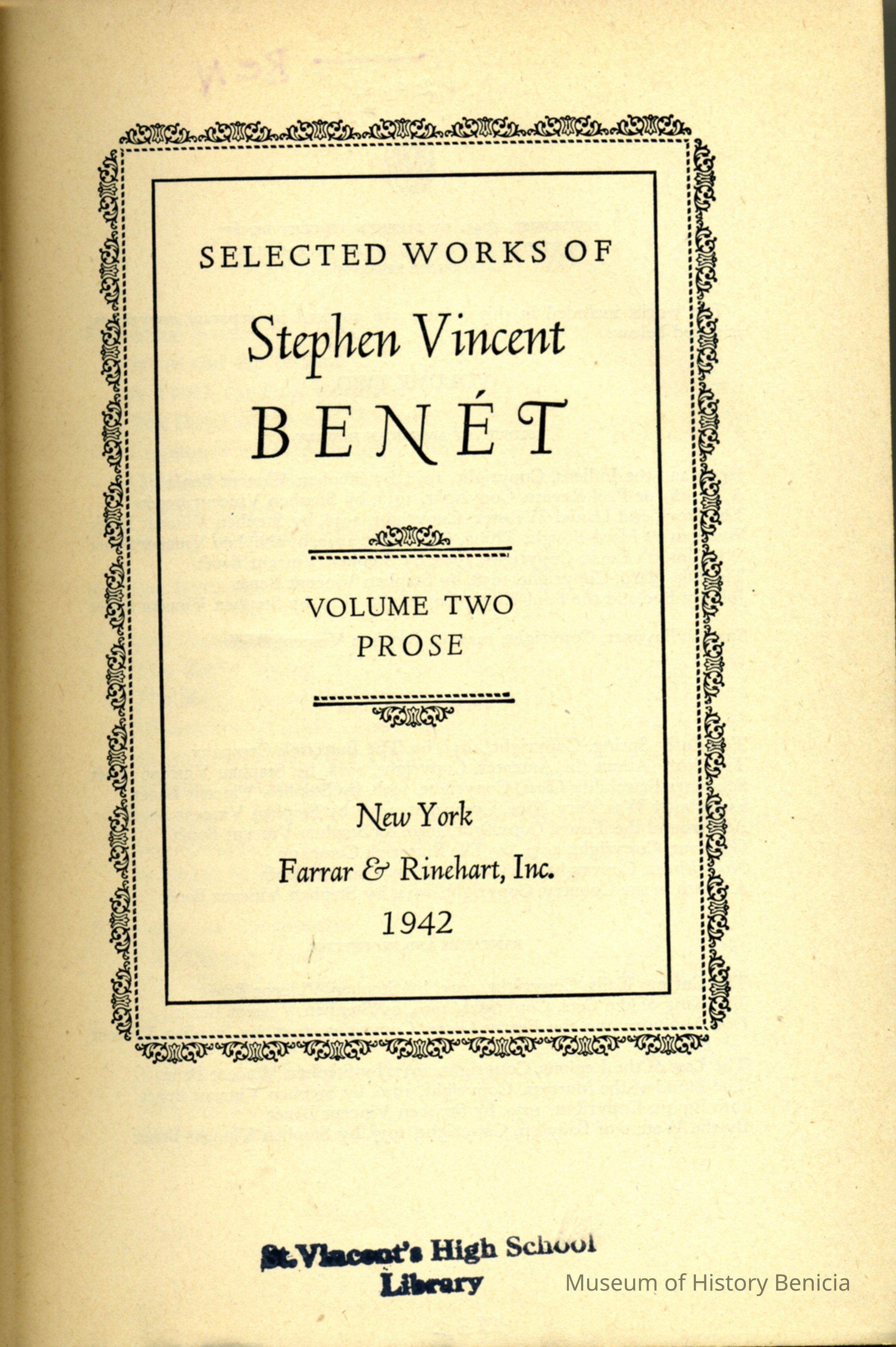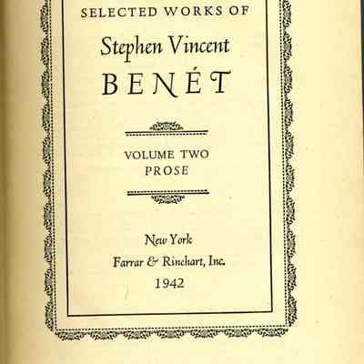 Selected Works of Stephen Vincent Benet. Black cover, attached inside back cover is "St. Vincent's High School" library card. "Discard" stamped on bottom of the pages of the book.Collection