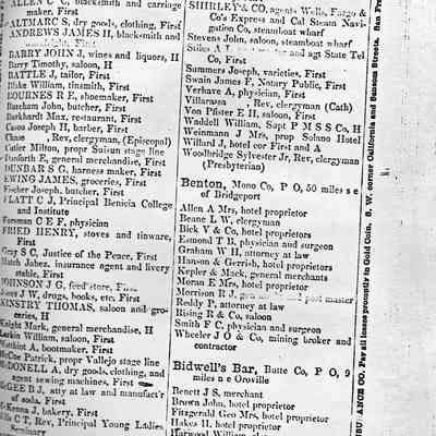 Two photocopied pages (stapled together) from the Pacific Coast Business Directory. Specifically shows Benicia businesses. Handwritten date says 1869. Good resource to know what businesses were established at that time.