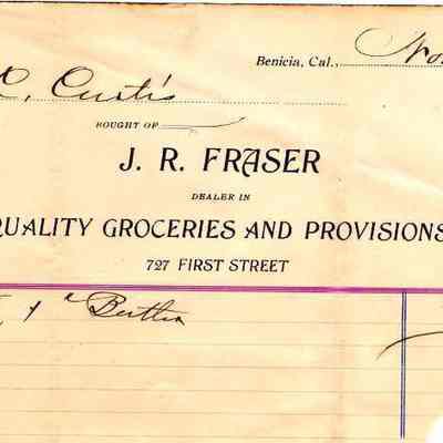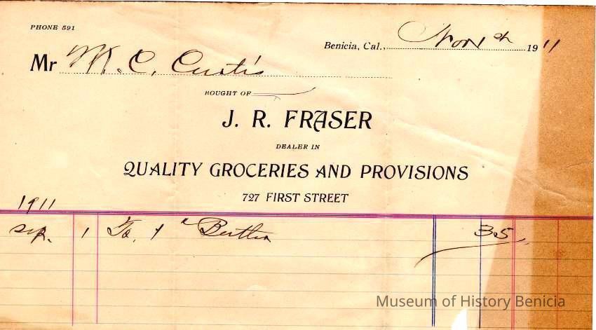 Account page for M C Curtis from J R Fraser grocer (727 First Street). It is dated 1911 is for ??? & Butter for $.35.