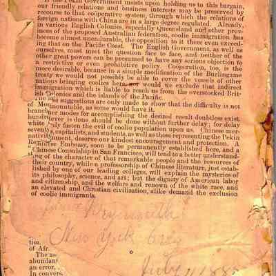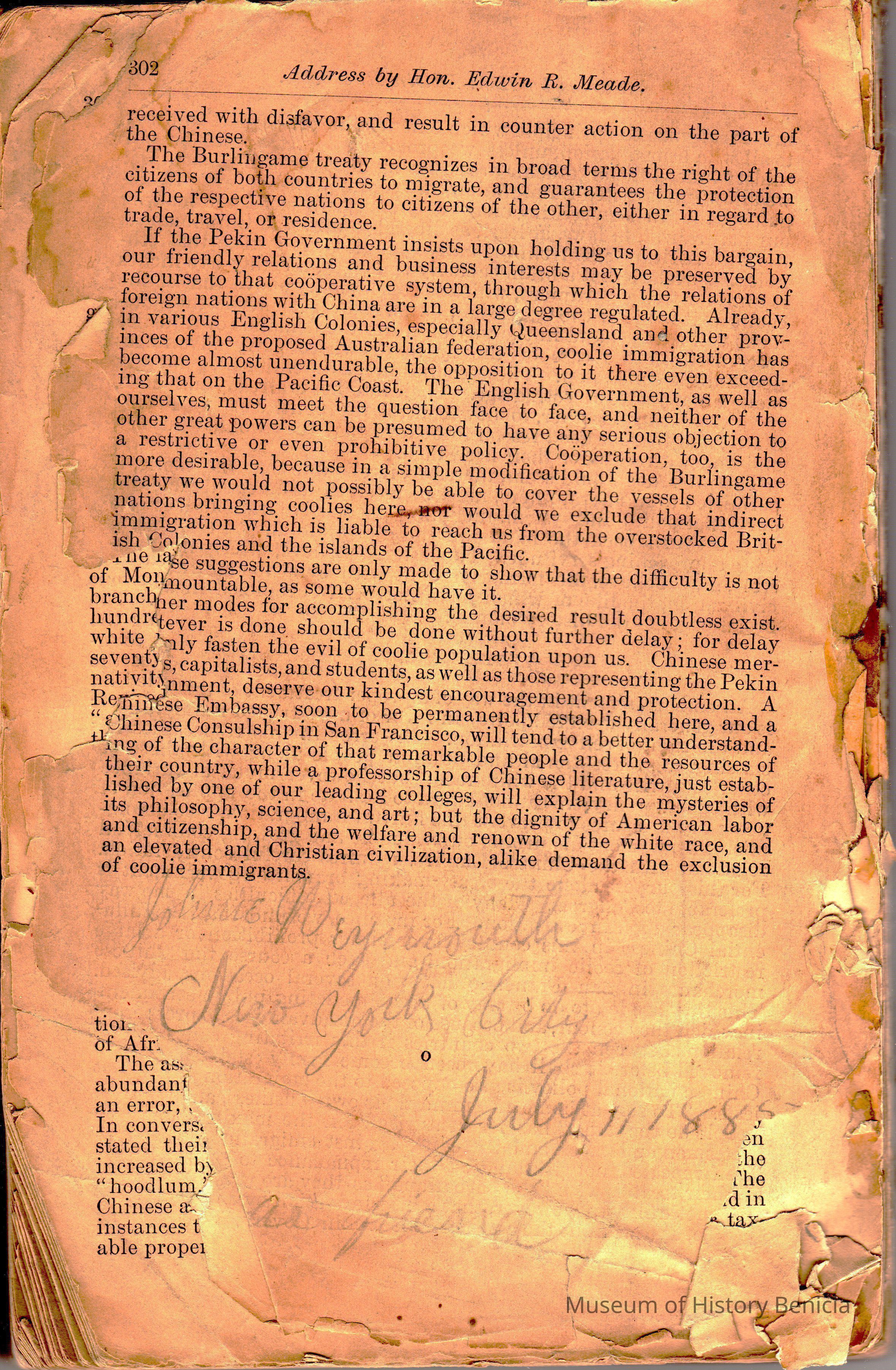 NOTE: A Memorial to the US Congress is attached which contains selections from the Chinese Immigration review done by the California Senate. It has sections of the original report that give an idea of what the original report contained.Collection