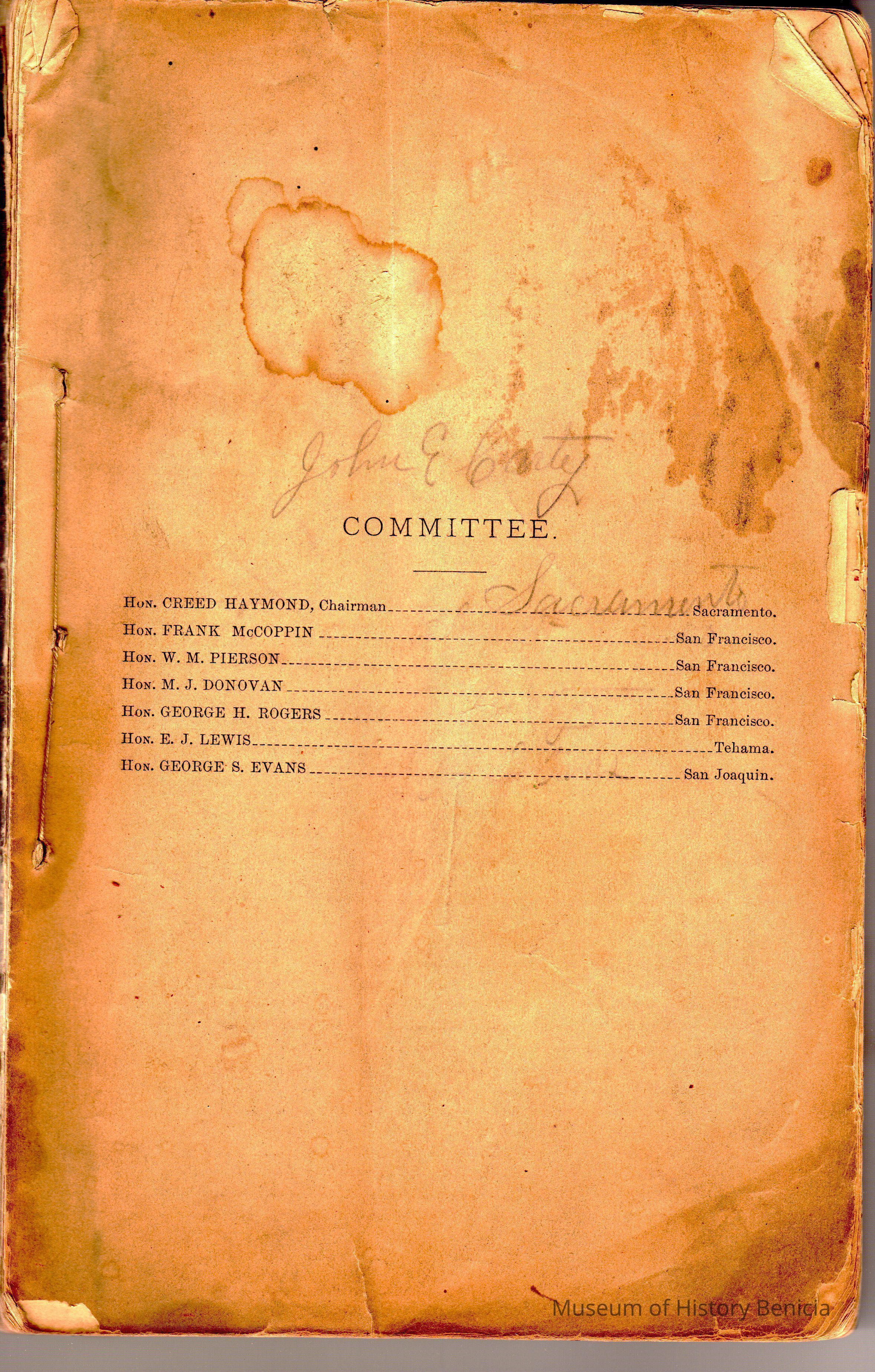Book showing the proceedings of some committee in Sacramento. ( A copy of the book is online and can be viewed in its entirety by selecting the link in the Media button.)